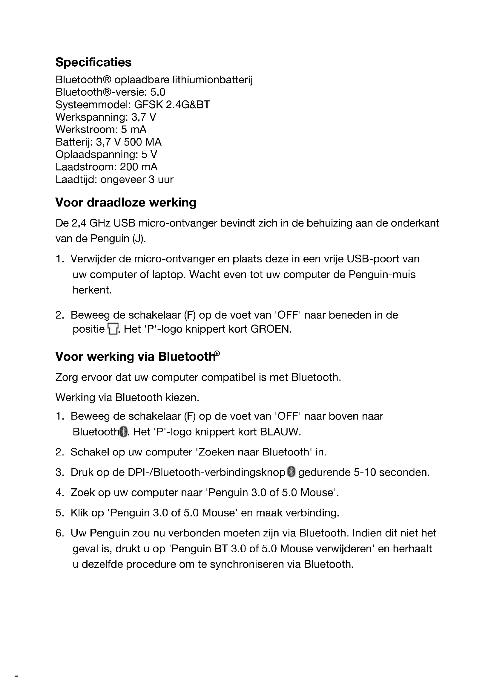 geval is, drukt u op 'Penguin BT 3.0 of 5.0 Mouse verwijderen' en herhaalt u dezelfde procedure om te synchroniseren via Bluetooth.Automatische stroombesparing Na ongeveer 20 seconden inactiviteit - Penguin komt in de stroombesparingsmodus. Na ongeveer 5 minuten - Penguin komt in de diepe slaapmodus. Inactief - klik met een knop om de muis wakker te maken Opmerking: Het is aanbevolen om de Penguin in de 'OFF'-stand te zetten als deze wordt vervoerd, om energie te besparen. Oplaadbare batterij De draadloze Penguin bevat een interne, oplaadbare batterij. Het is mogelijk dat deze batterij al gedeeltelijk is opgeladen. U kunt de batterij volledig opladen door het USB-uiteinde van de kabel (G) in een beschikbare USB-poort van uw computer te steken en het USB-C uiteinde van de kabel in de voorzijde van uw muis (I) te steken; zie diagram. Raadpleeg de sectie Gedrag oplaadlampje voor meer over het batterijniveau. Indicator oplaadbare batterij bijna leeg IJsblauw lampje knippert Batterij bijna leeg (ongeveer 20% lading resterend) Gedrag oplaadlampje Wanneer de oplaadkabel is aangesloten, geeft een reeks gekleurde lampjes in het verlichte "P"-logo verschillende batterijniveaus aan. Penguin in ACTIEVE modus: Oranje lampje + knipperend ijsblauw lampje Batterij is aan het opladen (minder dan 20% lading) Oranje lampje + gestaag brandend ijsblauw lampje Batterij is aan het opladen (meer dan 20% lading) Alleen ijsblauw lampje De batterij is volledig opgeladen Penguin in INACTIEVE modus: Oranje "P"-lampje Batterij is aan het opladen Oranje "P"-lampje gaat uit zodra volledig opgeladen.Plug & play De Penguin-muis maakt gebruik van Plug & Play-technologie. Er is geen extra software nodig. Rechtshandig en linkshandig gebruik De Penguin is standaard ingesteld voor rechtshandig gebruik. Als u de muis met de linkerhand wilt gebruiken, hoeft u alleen het hogere deel van de tuimelschakelaar (D) aan de voorkant van de Penguin in te drukken. Hierdoor wordt de richting van het scrollwiel aangepast. Variabele DPI [800-1200-1600-2400] - Snelheid aanwijzer De standaardinstelling is 800 DPI. U kunt dit aanpassen door de DPI-knop (E) aan de voet van de Penguin in te drukken en los te laten. Het verlichte "P"-logo zal knipperen om aan te geven dat de DPI is veranderd. DPI (snelheid aanwijzer) Aantal keren knipperen Snelheid 800 DPI 1 x knipperen "P" Langzaam 1200 DPI 2 x knipperen "PP" Gemiddeld 1600 DPI 3 x knipperen "PPP" Snel 2400 DPI 4 x knipperen "PPPP" Snelst Precisie-scrollwiel met autoscrollen De Penguin-muis is niet alleen voorzien van een gevoelig, zacht aanvoelend precisie-scrollwiel (C) maar ook van een autoscrollfunctie. U activeert deze functie door het scrollwiel naar binnen of naar beneden te klikken. Beweeg de Penguin naar voren of naar achteren om automatisch met de gewenste snelheid te gaan scrollen. Klik opnieuw met het scrollwiel om het automatisch scrollen te stoppen. PROBLEEMOPLOSSING NB: De USB-dongle bevindt zich in een vakje in de voet van de Penguin.