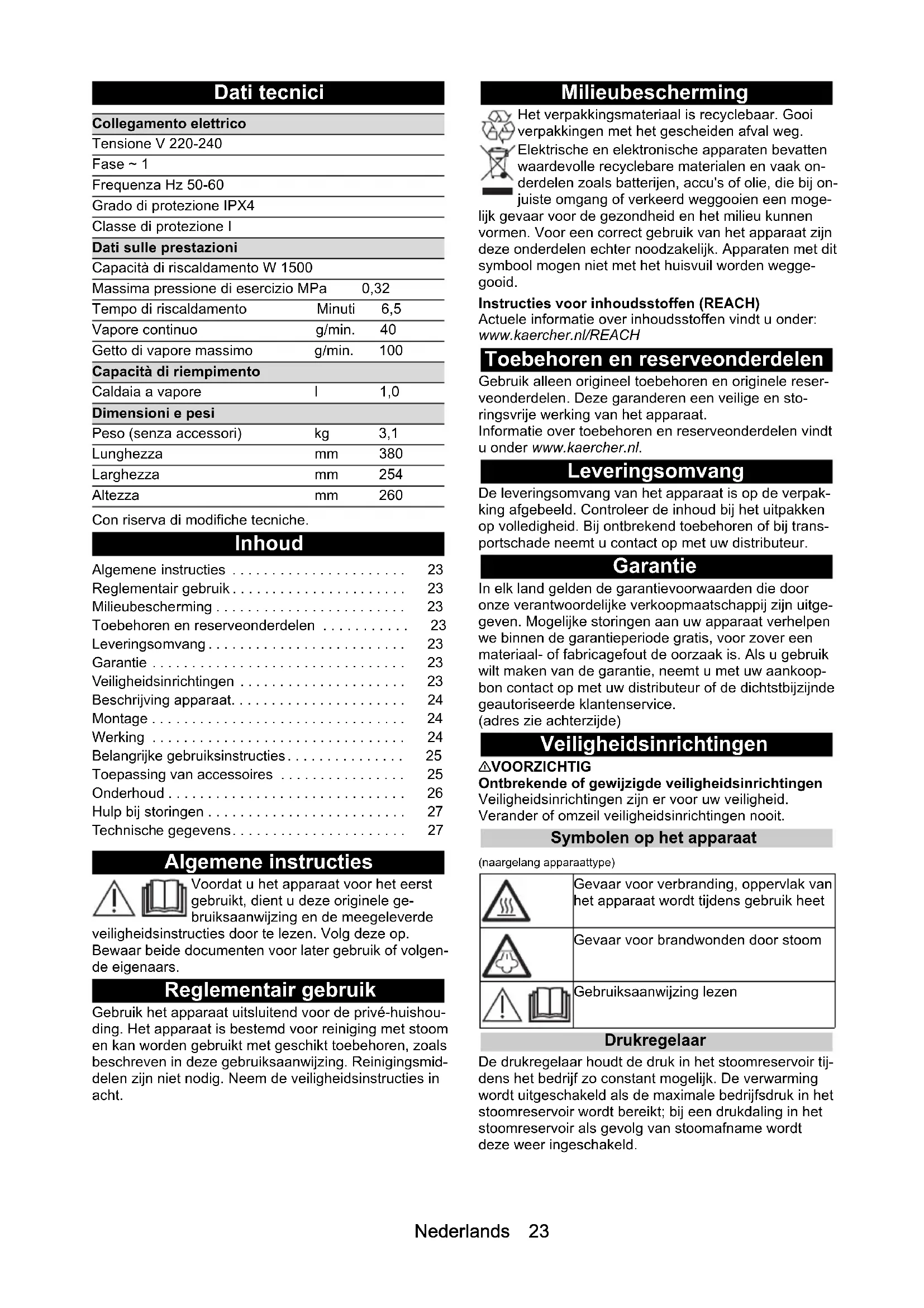 - 60 °C in lavatrice. Aiuto in caso di guasti I guasti hanno spesso cause semplici che possono es- sere risolte con l’ausilio della panoramica seguente. In caso di dubbi o di guasti qui non menzionati si consiglia di rivolgersi al servizio assistenza autorizzato. 몇 AVVERTIMENTO Pericolo di scossa elettrica e ustione! Fino a che l’apparecchio è collegato alla rete o non si è ancora raffreddato, è pericoloso riparare i guasti. Staccare la spina. Lasci raffreddare l’apparecchio. La caldaia a vapore presenta incrostazioni di calcare. Decalcificare la caldaia a vapore. No vapore Non c’è acqua nella caldaia a vapore Rabboccare l’acqua, vedi capitolo Versare altra acqua. Impossibile premere la leva vapore La leva vapore è fissata con la sicura bambini. Posizionare verso l’avanti la sicurezza bambini (se- lettore della quantità di vapore). La leva vapore è sbloccata. Tempo di riscaldamento lungo La caldaia a vapore presenta incrostazioni di calcare. Decalcificare la caldaia a vapore. Elevata fuoriuscita d’acqua La caldaia a vapore è troppo piena. Premere la pistola a vapore fino a quando non fuo- riesce meno acqua. Elevata fuoriuscita d’acqua La caldaia a vapore presenta incrostazioni di calcare. Decalcificare la caldaia a vapore. Campo di durezza °dH mmol/l KF I dolce 0-7 0-1,3 55 II media 7-14 1,3-2,5 45 III dura 14-21 2,5-3,8 35 IV molto dura >21 >3,8 25Nederlands 23 Dati tecnici Con riserva di modifiche tecniche. Inhoud Algemene instructies Voordat u het apparaat voor het eerst gebruikt, dient u deze originele ge- bruiksaanwijzing en de meegeleverde veiligheidsinstructies door te lezen. Volg deze op. Bewaar beide documenten voor later gebruik of volgen- de eigenaars. Reglementair gebruik Gebruik het apparaat uitsluitend voor de privé-huishou- ding. Het apparaat is bestemd voor reiniging met stoom en kan worden gebruikt met geschikt toebehoren, zoals beschreven in deze gebruiksaanwijzing. Reinigingsmid- delen zijn niet nodig. Neem de veiligheidsinstructies in acht. Milieubescherming Het verpakkingsmateriaal is recyclebaar. Gooi verpakkingen met het gescheiden afval weg. Elektrische en elektronische apparaten bevatten waardevolle recyclebare materialen en vaak on- derdelen zoals batterijen, accu's of olie, die bij on- juiste omgang of verkeerd weggooien een moge- lijk gevaar voor de gezondheid en het milieu kunnen vormen. Voor een correct gebruik van het apparaat zijn deze onderdelen echter noodzakelijk. Apparaten met dit symbool mogen niet met het huisvuil worden wegge- gooid. Instructies voor inhoudsstoffen (REACH) Actuele informatie over inhoudsstoffen vindt u onder: www.kaercher.nl/REACH Toebehoren en reserveonderdelen Gebruik alleen origineel toebehoren en originele reser- veonderdelen. Deze garanderen een veilige en sto- ringsvrije werking van het apparaat. Informatie over toebehoren en reserveonderdelen vindt u onder www.kaercher.nl. Leveringsomvang De leveringsomvang van het apparaat is op de verpak- king afgebeeld. Controleer de inhoud bij het uitpakken op volledigheid. Bij ontbrekend toebehoren of bij trans- portschade neemt u contact op met uw distributeur. Garantie In elk land gelden de garantievoorwaarden die door onze verantwoordelijke verkoopmaatschappij zijn uitge- geven. Mogelijke storingen aan uw apparaat verhelpen we binnen de garantieperiode gratis, voor zover een materiaal- of fabricagefout de oorzaak is. Als u gebruik wilt maken van de garantie, neemt u met uw aankoop- bon contact op met uw distributeur of de dichtstbijzijnde geautoriseerde klantenservice. (adres zie achterzijde) Veiligheidsinrichtingen 몇 VOORZICHTIG Ontbrekende of gewijzigde veiligheidsinrichtingen Veiligheidsinrichtingen zijn er voor uw veiligheid. Verander of omzeil veiligheidsinrichtingen nooit. Symbolen op het apparaat (naargelang apparaattype) Drukregelaar De drukregelaar houdt de druk in het stoomreservoir tij- dens het bedrijf zo constant mogelijk. De verwarming wordt uitgeschakeld als de maximale bedrijfsdruk in het stoomreservoir wordt bereikt; bij een drukdaling in het stoomreservoir als gevolg van stoomafname wordt deze weer ingeschakeld. Collegamento elettrico Tensione V 220-240 Fase ~ 1 Frequenza Hz 50-60 Grado di protezione IPX4 Classe di protezione I Dati sulle prestazioni Capacità di riscaldamento W 1500 Massima pressione di esercizio MPa 0,32 Tempo di riscaldamento Minuti 6,5 Vapore continuo g/min. 40 Getto di vapore massimo g/min. 100 Capacità di riempimento Caldaia a vapore l 1,0 Dimensioni e pesi Peso (senza accessori) kg 3,1 Lunghezza mm 380 Larghezza mm 254 Altezza mm 260 Algemene instructies p. 23