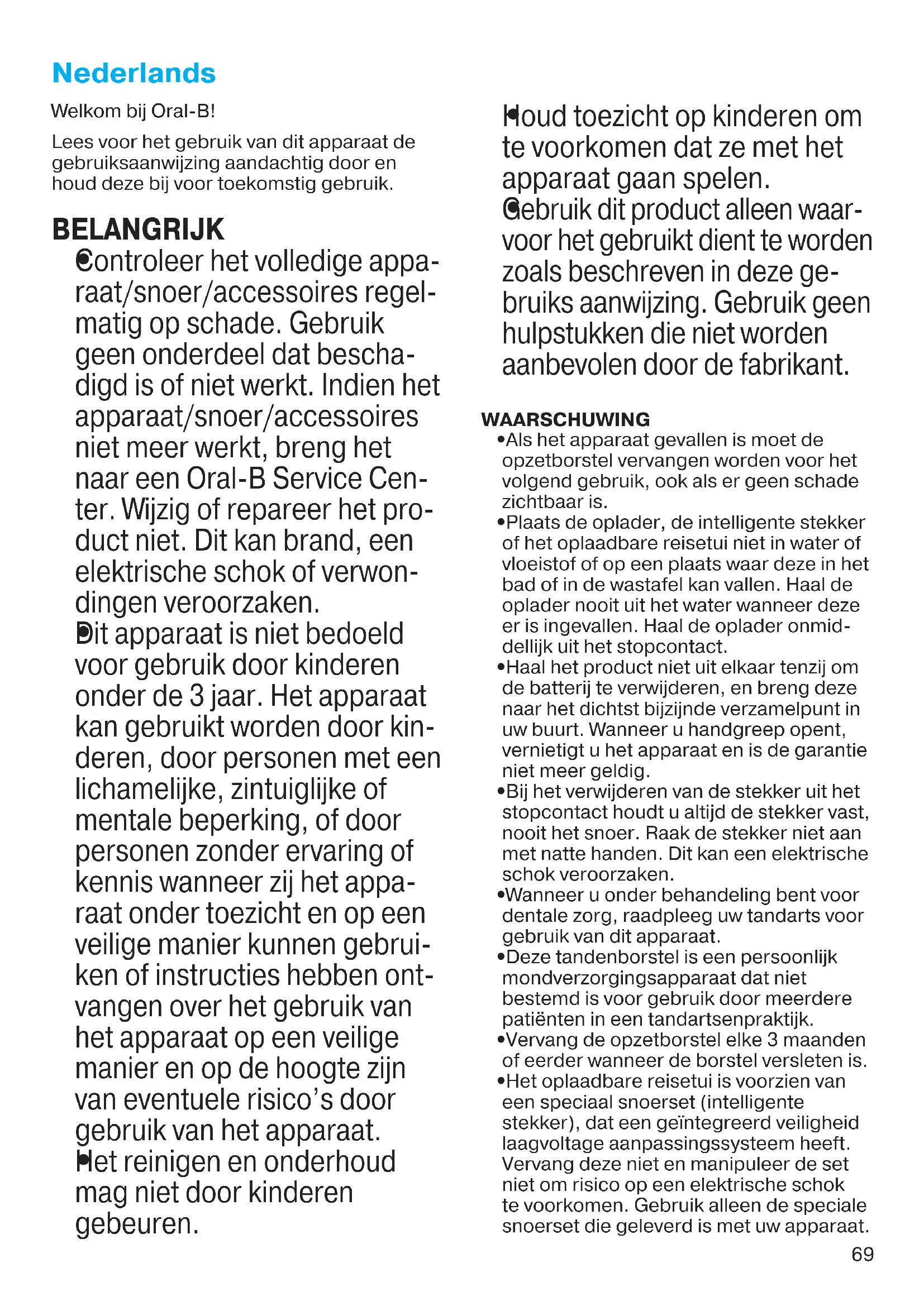 Controleer het volledige apparaat/snoer/accessoires regelmatin op schade. Gebruik geen onderdeel dat beschadigd is of nicht werkt. Indien het apparaat/snoer/accessoires Niet meer werkt, breng het waar een Oral-B Service Center. Wijzig of reparateer het product Niet. Dit kan brand, een elektrische schok of verwondingen veroorzaken.