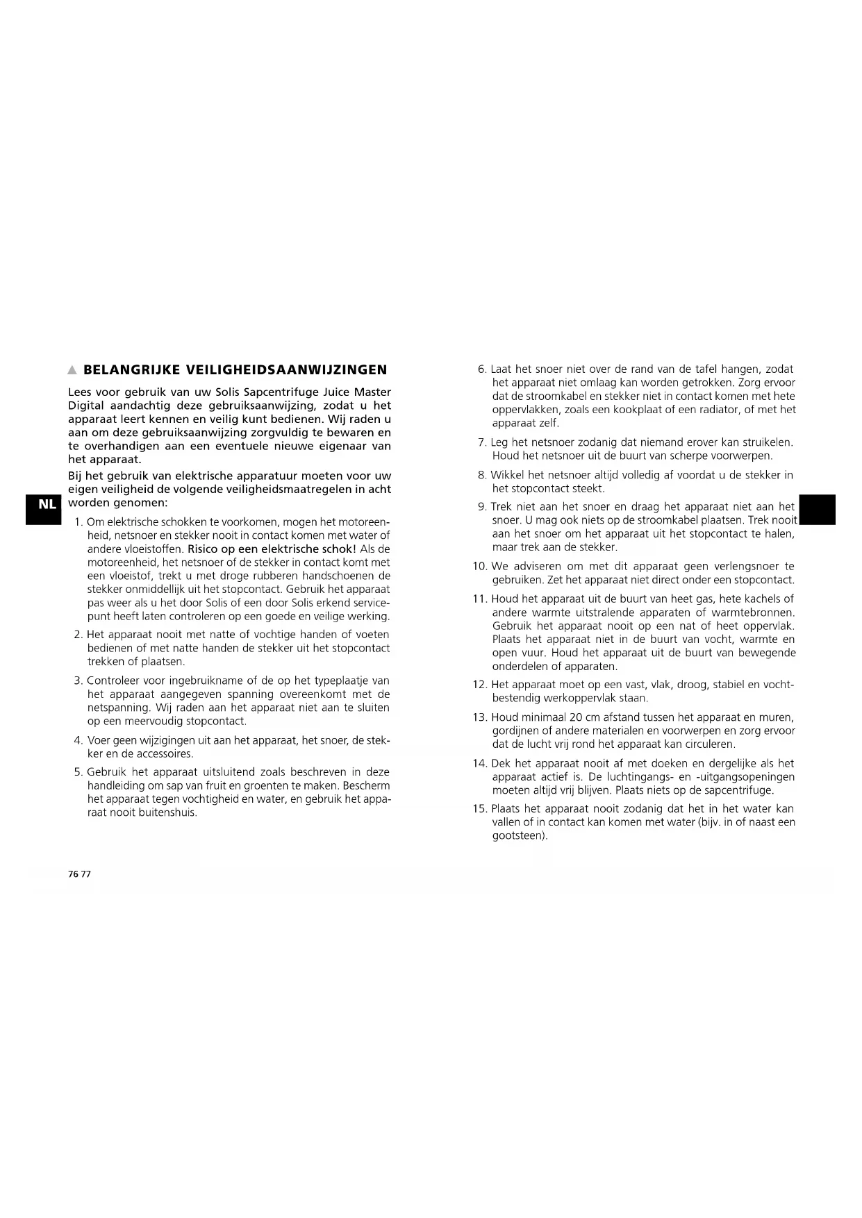 BELANGRIJKE VEILIGHEIDSAANWIJZINGEN Lees voor gebruik van uw Solis Sapcentrifuge Juice Master Digital aandachtig deze gebruiksaanwijzing, zodat u het apparaat leert kennen en veilig kunt bedienen. Wij raden u aan om deze gebruiksaanwijzing zorgvuldig te bewaren en te overhandigen aan een eventuele nieuwe eigenaar van het apparaat. Bij het gebruik van elektrische apparatuur moeten voor uw eigen veiligheid de volgende veiligheidsmaatregelen in acht worden genomen: