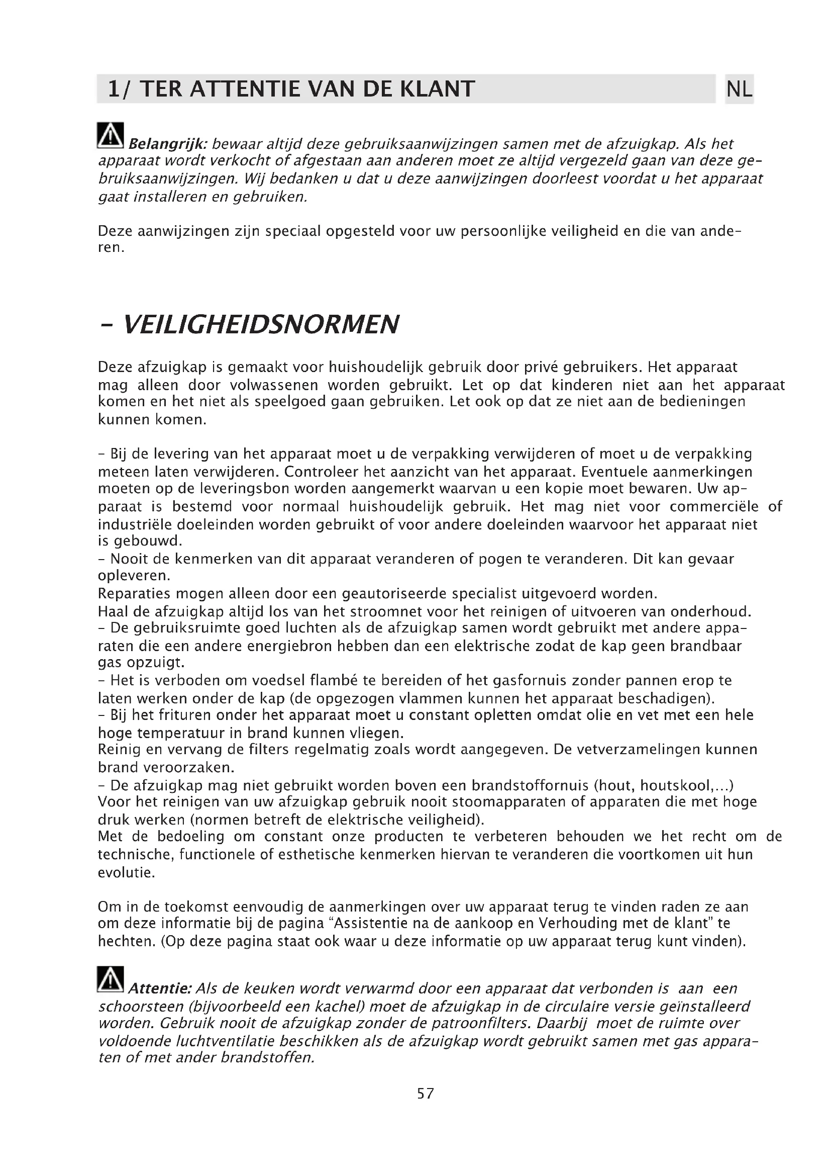 Belangrijk: bewaar altijd deze gebruiksaanwijzingen samen met de afzuigkap. Als het apparaat wordt verkocht of afgestaan aan anderen moet ze altijd vergezeld gaan van deze ge- bruiksaanwijzingen. Wij bedanken u dat u deze aanwijzingen doorleest voordat u het apparaat gaat installeren en gebruiken. Deze aanwijzingen zijn speciaal opgesteld voor uw persoonlijke veiligheid en die van ande- ren. - VEILIGHEIDSNORMEN Deze afzuigkap is gemaakt voor huishoudelijk gebruik door privé gebruikers. Het apparaat mag alleen door volwassenen worden gebruikt. Let op dat kinderen niet aan het apparaat komen en het niet als speelgoed gaan gebruiken. Let ook op dat ze niet aan de bedieningen kunnen komen. - Bij de levering van het apparaat moet u de verpakking verwijderen of moet u de verpakking meteen laten verwijderen. Controleer het aanzicht van het apparaat. Eventuele aanmerkingen moeten op de leveringsbon worden aangemerkt waarvan u een kopie moet bewaren. Uw ap- paraat is bestemd voor normaal huishoudelijk gebruik. Het mag niet voor commerciële of industriële doeleinden worden gebruikt of voor andere doeleinden waarvoor het apparaat niet is gebouwd. - Nooit de kenmerken van dit apparaat veranderen of pogen te veranderen. Dit kan gevaar opleveren. Reparaties mogen alleen door een geautoriseerde specialist uitgevoerd worden. Haal de afzuigkap altijd los van het stroomnet voor het reinigen of uitvoeren van onderhoud. - De gebruiksruimte goed luchten als de afzuigkap samen wordt gebruikt met andere appa- raten die een andere energiebron hebben dan een elektrische zodat de kap geen brandbaar gas opzuigt. - Het is verboden om voedsel flambé te bereiden of het gasfornuis zonder pannen erop te laten werken onder de kap (de opgezogen vlammen kunnen het apparaat beschadigen). - Bij het frituren onder het apparaat moet u constant opletten omdat olie en vet met een hele hoge temperatuur in brand kunnen vliegen. Reinig en vervang de filters regelmatig zoals wordt aangegeven. De vetverzamelingen kunnen brand veroorzaken. - De afzuigkap mag niet gebruikt worden boven een brandstoffornuis (hout, houtskool,…) Voor het reinigen van uw afzuigkap gebruik nooit stoomapparaten of apparaten die met hoge druk werken (normen betreft de elektrische veiligheid). Met de bedoeling om constant onze producten te verbeteren behouden we het recht om de technische, functionele of esthetische kenmerken hiervan te veranderen die voortkomen uit hun evolutie. Om in de toekomst eenvoudig de aanmerkingen over uw apparaat terug te vinden raden ze aan om deze informatie bij de pagina “Assistentie na de aankoop en Verhouding met de klant” te hechten. (Op deze pagina staat ook waar u deze informatie op uw apparaat terug kunt vinden). Attentie: Als de keuken wordt verwarmd door een apparaat dat verbonden is aan een schoorsteen (bijvoorbeeld een kachel) moet de afzuigkap in de circulaire versie geïnstalleerd worden. Gebruik nooit de afzuigkap zonder de patroonfilters. Daarbij moet de ruimte over voldoende luchtventilatie beschikken als de afzuigkap wordt gebruikt samen met gas appara- ten of met ander brandstoffen.8