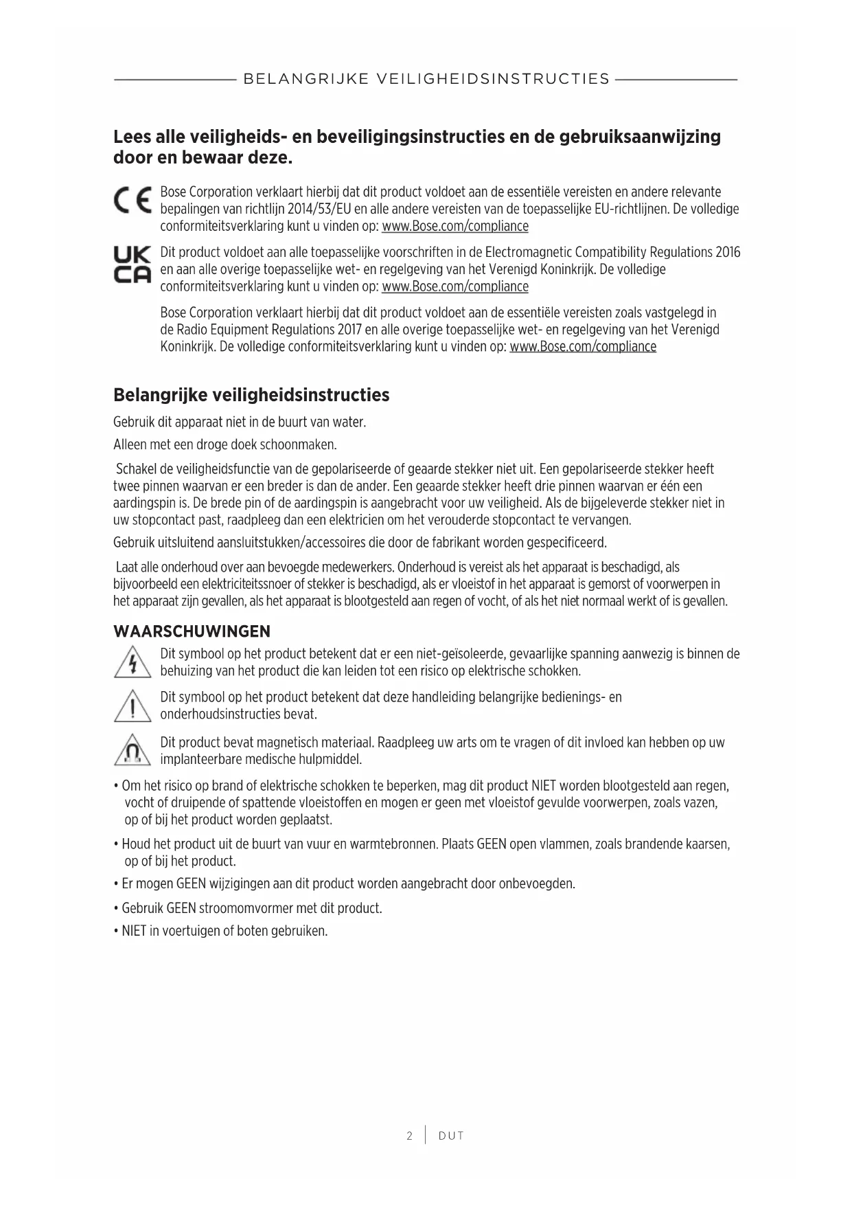 Dit product voldoet aan alle toepasselijke voorschriften in de Electromagnetic Compatibility Regulations 2016 en aan alle overige toepasselijke wet- en regelgeving van het Verenigd Koninkrijk. De volledige conformiteitsverklaring kut u vinden op: www.Bose.com/compliance