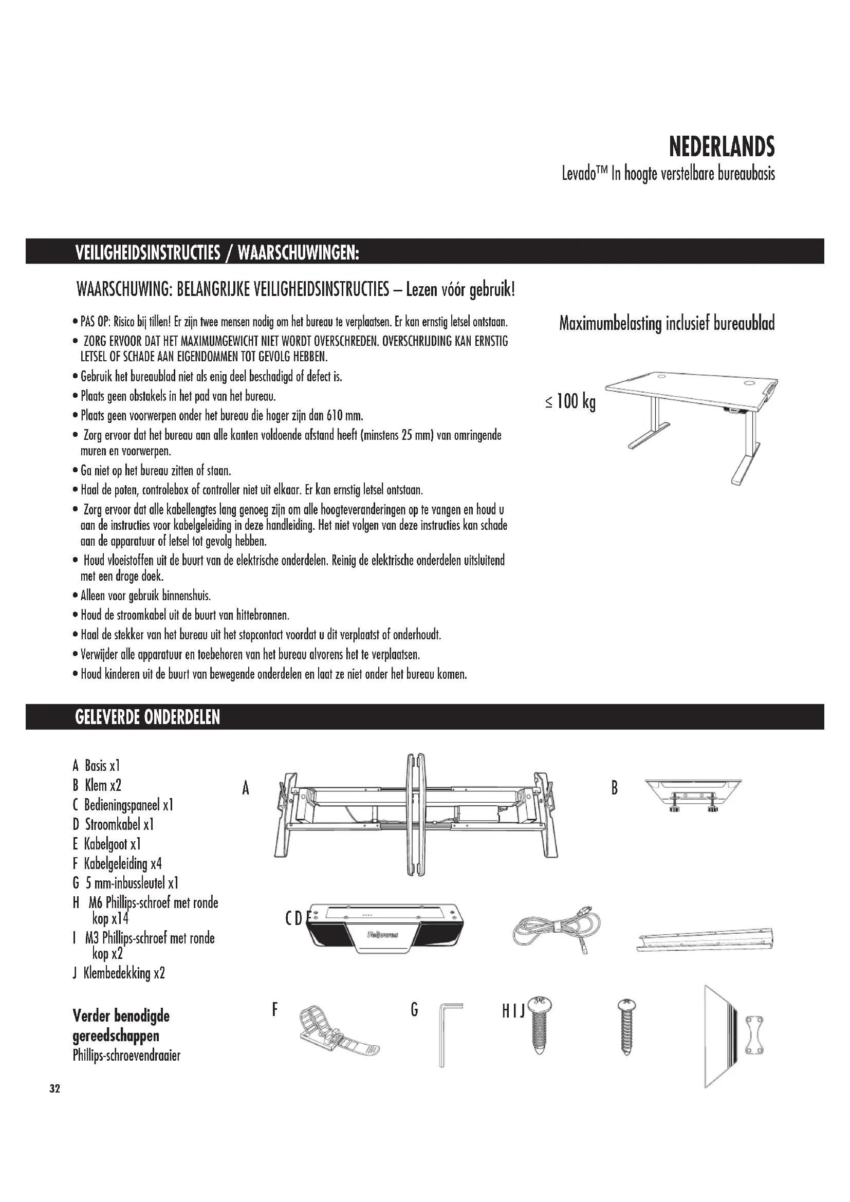 PAS OP: Risico bij tillen! Er zijn twee mensen nodig om het bureau te verplaatsen. Er kan ernstig letsel ontstaan. • ZORG ERVOOR DAT HET MAXIMUMGEWICHT NIET WORDT OVERSCHREDEN. OVERSCHRIJDING KAN ERNSTIG LETSEL OF SCHADE AAN EIGENDOMMEN TOT GEVOLG HEBBEN.• Gebruik het bureaublad niet als enig deel beschadigd of defect is. • Plaats geen obstakels in het pad van het bureau.• Plaats geen voorwerpen onder het bureau die hoger zijn dan 610 mm. • Zorg ervoor dat het bureau aan alle kanten voldoende afstand heeft (minstens 25 mm) van omringende muren en voorwerpen.• Ga niet op het bureau zitten of staan.• Haal de poten, controlebox of controller niet uit elkaar. Er kan ernstig letsel ontstaan.• Zorg ervoor dat alle kabellengtes lang genoeg zijn om alle hoogteveranderingen op te vangen en houd u aan de instructies voor kabelgeleiding in deze handleiding. Het niet volgen van deze instructies kan schade aan de apparatuur of letsel tot gevolg hebben. • Houd vloeistoffen uit de buurt van de elektrische onderdelen. Reinig de elektrische onderdelen uitsluitend met een droge doek.• Alleen voor gebruik binnenshuis.• Houd de stroomkabel uit de buurt van hittebronnen.• Haal de stekker van het bureau uit het stopcontact voordat u dit verplaatst of onderhoudt. • Verwijder alle apparatuur en toebehoren van het bureau alvorens het te verplaatsen.• Houd kinderen uit de buurt van bewegende onderdelen en laat ze niet onder het bureau komen. A B C D E H I J GF33