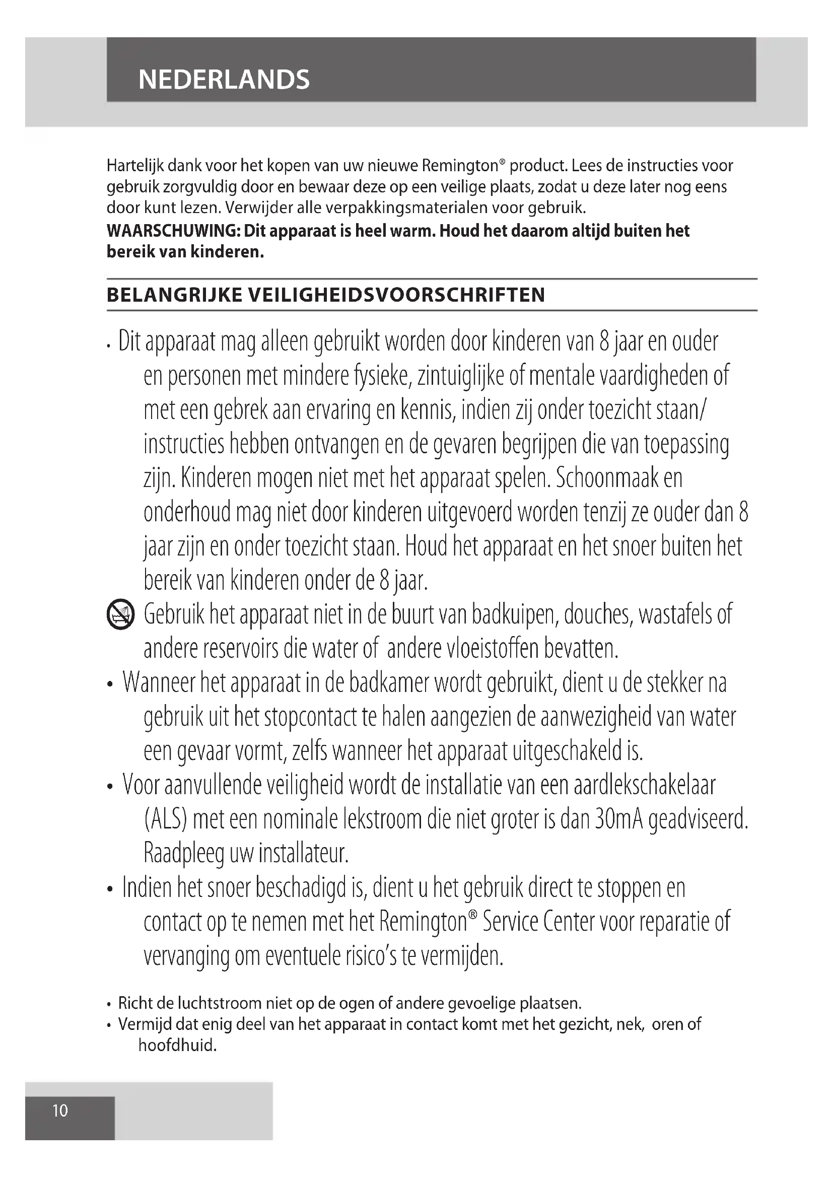 - Indien het snoer beschadigd is, dient u het gebruik direct te stoppen en contact op te nemen met het Remington® Service Center voor reparatie of vervanging om eventuele risico’s te vermijden.