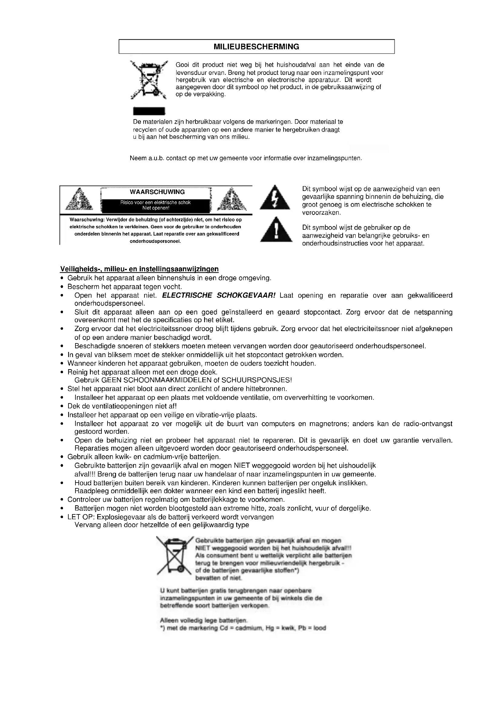 Gebruekte batterijen zich gevaarlijk afval en mogen NIET weggegoood worden bij het huishoudelijk afval!! Als consument bent u wettelijk verplicht alle batterijen terug te brengen voor milieuvriendelijk hergebruik - of de batterijen gevaarlijke stoffen*) bevatten of Niet.