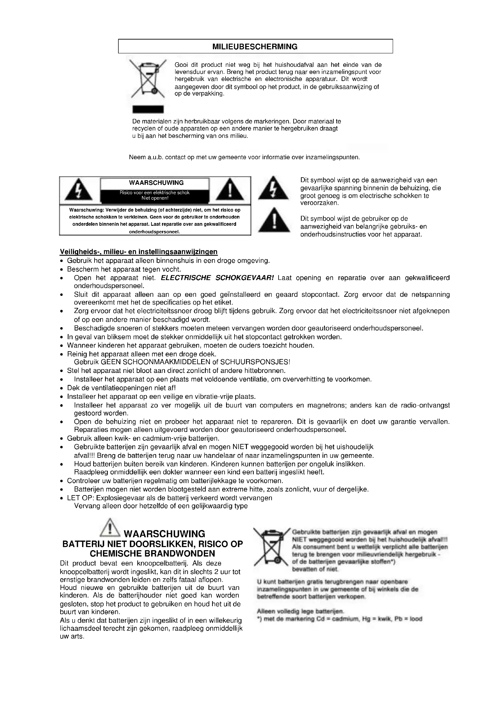 Gebruikte batterijen zijn gevaarlijk afval en mogen NIET weggegooid worden bij het huishoudelijk afval!!! Als consument bent u wettelijk verplicht alle batterijen terug te brengen voor milieuvriendelijk hergebruik - of de batterijen gevaarlijke stoffen*) bevatten of niet.