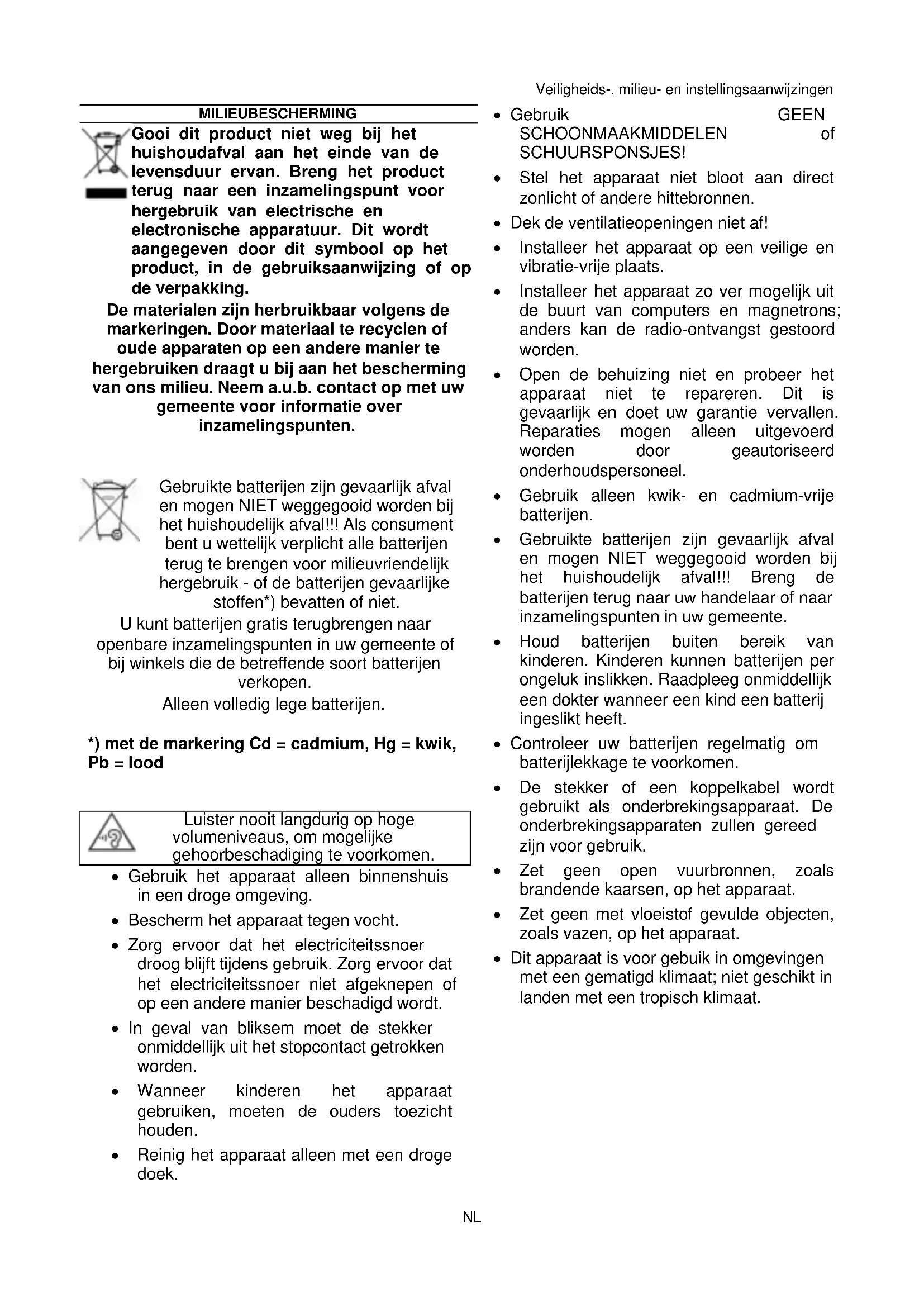 - Gebruik alleen kwik- en cadmium-vrije batterijen.