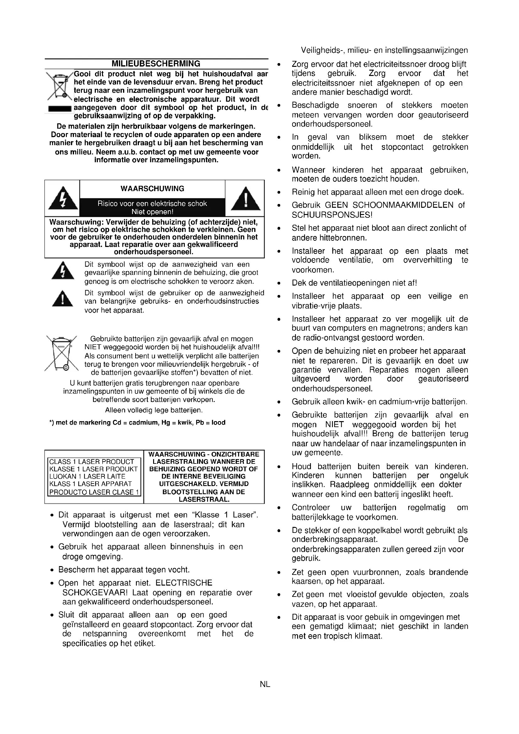 | CLASS 1 LASER PRODUCT KLASSE 1 LASER PRODUKT LUOKAN 1 LASER LAITE KCLASS 1 LASER APPARAT PRODUCTO LASER CLASE 1 | WAARSCHUWING - ONZICHTBARE LASERSTRALING WANNEER DE BEHUIZING GEOPEND WORDT OF DE INTERNE BEVEILIGING UITGESCHAKELD. VERMIJD BLOOTSTELLING AAN DE LASERSTRAAL. |