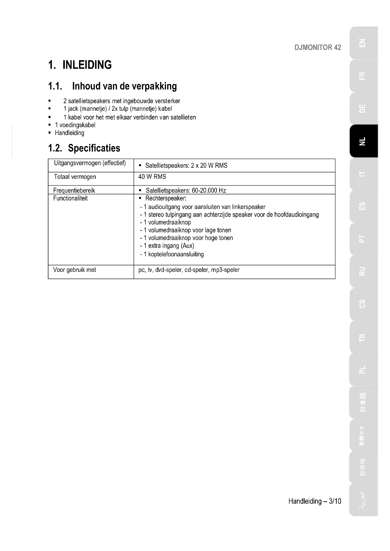 1.1. Inhoud van de verpakking 2 satellietspeakers met ingebouwde versterker 1 jack (mannetje) / 2x tulp (mannetje) kabel 1 kabel voor het met elkaar verbinden van satellieten 1 voedingskabel Handleiding 1.2. Specificaties Uitgangsvermogen (effectief) Satellietspeakers: 2 x 20 W RMS Totaal vermogen 40 W RMS Frequentiebereik Satellietspeakers: 60-20.000 Hz Functionaliteit Rechterspeaker: - 1 audiouitgang voor aansluiten van linkerspeaker - 1 stereo tulpingang aan achterzijde speaker voor de hoofdaudioingang - 1 volumedraaiknop - 1 volumedraaiknop voor lage tonen - 1 volumedraaiknop voor hoge tonen - 1 extra ingang (Aux) - 1 koptelefoonaansluiting Voor gebruik met pc, tv, dvd-speler, cd-speler, mp3-spelerDJMONITOR 42 4/10 – Handleiding 1.3. Aanbevelingen - Plaats de satellietspeakers op een vlakke ondergrond om te voorkomen dat ze omvallen. - Maak de speakerkit nooit open omdat het gevaar bestaat dat daarbij interne onderdelen worden beschadigd. - Deze speakerkit is bestemd voor gebruik in een gematigde omgeving. - Voorkom brand en elektrische ontlading door de speakerkit niet bloot te stellen aan: - regen, vocht en andere vloeistoffen, zoals water en chemische producten - hittebronnen als cv-radiatoren, open haard en andere warmte producerende apparaten (met inbegrip van versterkers) - direct zonlicht. - Stel de speakerkit niet bloot aan druppelend of spetterend water. - Zet nooit een met vloeistof gevuld object zoals een glas water of een vaas met bloemen op de speakerkit. - Maak de voedingskabel los als de speakerkit langere tijd niet wordt gebruikt. Maak de voedingskabel los door de stekker vast te pakken en daar aan te trekken. Trek nooit aan de kabel zelf. - Zorg er voor dat de stekker van de speakerkit die in het stopcontact zit altijd goed bereikbaar is. - Haal de stekker uit het stopcontact voordat u de speakerkit schoonmaakt. Gebruik een vochtige doek voor het reinigen en vermijd het gebruik van schoonmaakmiddelen in spuitbussen. - Omdat de speakerkit uitgezet wordt door de stekker uit het stopcontact te trekken, moet deze stekker altijd goed bereikbaar zijn. - De achterkant van elke speaker is voorzien van markeringen.