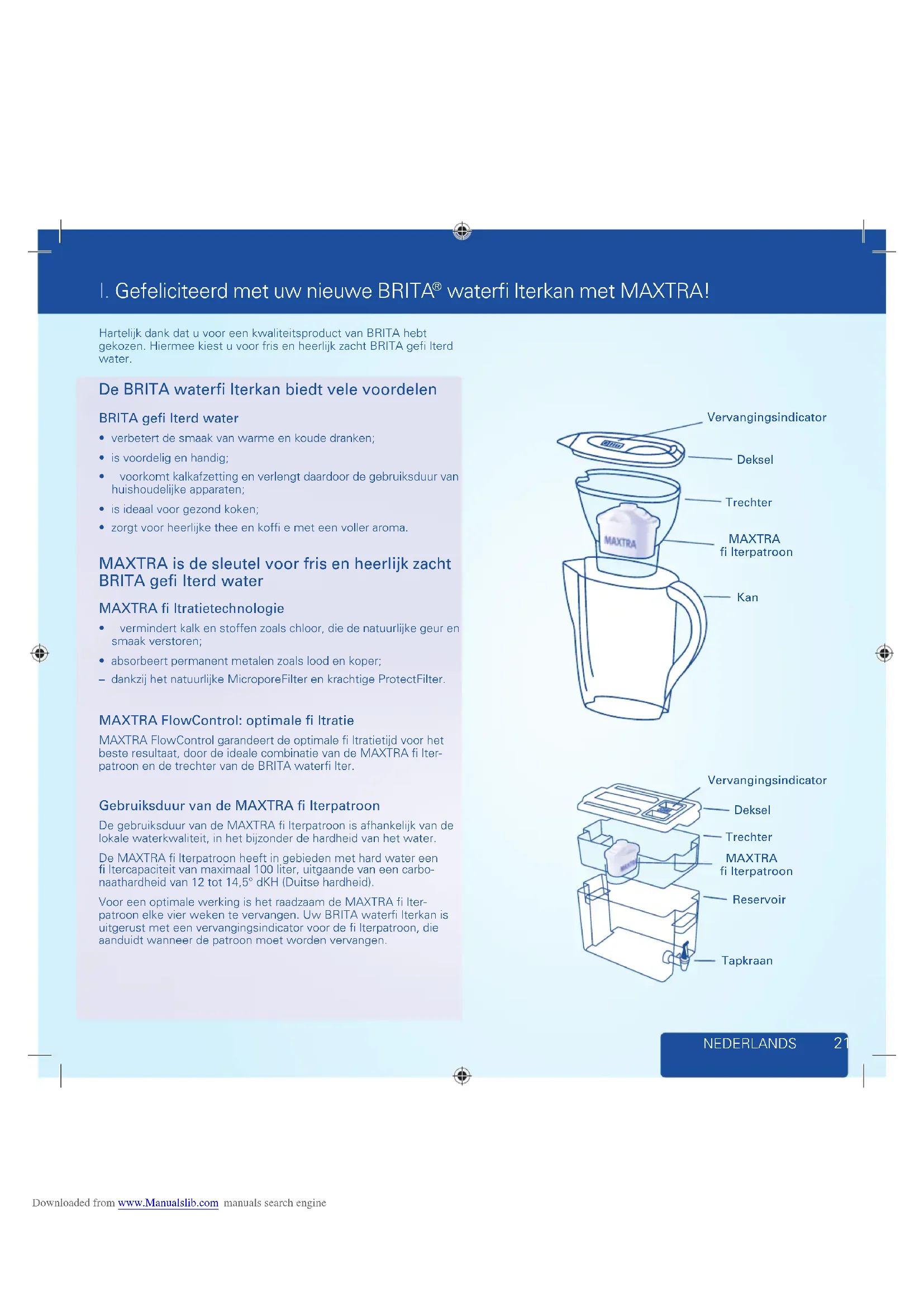 - vermindert kalk en stoffen zoals chloor, die de natuurlijke geur en smaak verstoren;• absorbeert permanent metalen zoals lood en koper;– dankzij het natuurlijke MicroporeFilter en krachtige ProtectFilter. MAXTRA FlowControl: optimale fi ltratie MAXTRA FlowControl garandeert de optimale fi ltratietijd voor het beste resultaat, door de ideale combinatie van de MAXTRA fi lter-patroon en de trechter van de BRITA waterfi lter. Gebruiksduur van de MAXTRA fi lterpatroon De gebruiksduur van de MAXTRA fi lterpatroon is afhankelijk van de lokale waterkwaliteit, in het bijzonder de hardheid van het water.De MAXTRA fi lterpatroon heeft in gebieden met hard water een fi ltercapaciteit van maximaal 100 liter, uitgaande van een carbo-naathardheid van 12 tot 14,5° dKH (Duitse hardheid).Voor een optimale werking is het raadzaam de MAXTRA fi lter-patroon elke vier weken te vervangen. Uw BRITA waterfi lterkan is uitgerust met een vervangingsindicator voor de fi lterpatroon, die aanduidt wanneer de patroon moet worden vervangen. Downloaded from www.Manualslib.com manuals search engine22 NEDERLANDS