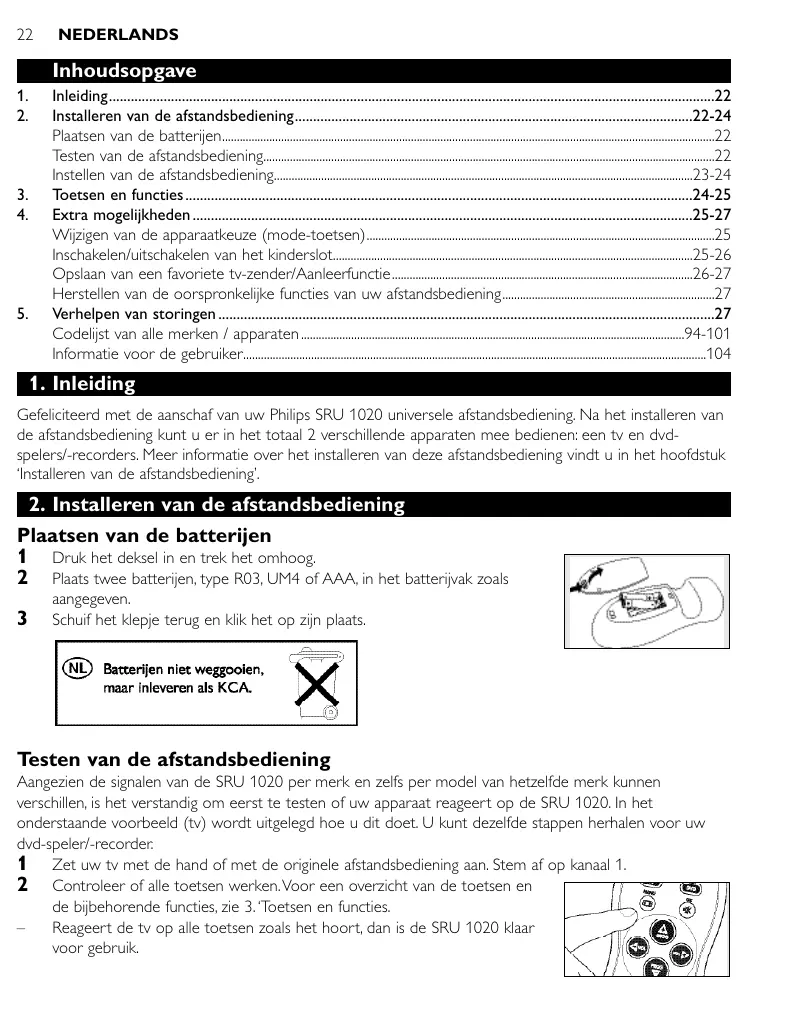 Gefeliciteerd met de aanschaf van uw Philips SRU 1020 universele afstandsbediening. Na het installeren van de afstandsbediening kunt u er in het totaal 2 verschillende apparaten mee bedienen: een tv en dvdspelers/-recorders. Meer informatie over het installeren van deze afstandsbediening vindt u in het hoofdstuk ‘Installeren van de afstandsbediening’.