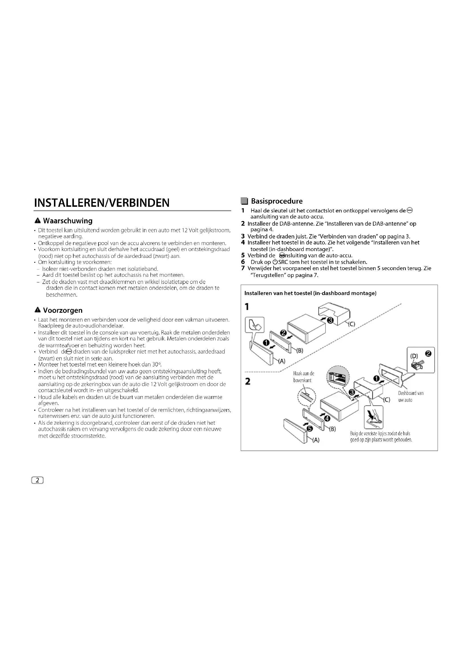 Vorspulen/Rückspule Halten Sie gedrückt. Wiederholte Wiedergabe Drücken Sie 4 wiederholt. Zufallswiedergabe Halten Sie die 3 gedrückt, um [ALLRANDOM] zu wählen. JS_KWD_QSG_KDC_BT730U_EN_GE.indd 12JS_KWD_QSG_KDC_BT730U_EN_GE.indd 12 20/8/2018 10:49:51 AM20/8/2018 10:49:51 AMJS_KWD_QSG_KDC_BT730U_EN_GE.indd 13JS_KWD_QSG_KDC_BT730U_EN_GE.indd 13 20/8/2018 10:49:52 AM20/8/2018 10:49:52 AM2 Data Size: B6L (182 mm x 128 mm)Book Size: B6L (182 mm x 128 mm) Basisprocedure 1 Haal de sleutel uit het contactslot en ontkoppel vervolgens de aansluiting van de auto-accu. 2 Installeer de DAB-antenne. Zie “Installeren van de DAB-antenne” op pagina4. 3 Verbind de draden juist. Zie “Verbinden van draden” op pagina3. 4 Installeer het toestel in de auto. Zie het volgende “Installeren van het toestel (in-dashboard montage)”. 5 Verbind de aansluiting van de auto-accu. 6 Druk op B SRC tom het toestel in te schakelen. 7 Verwijder het voorpaneel en stel het toestel binnen 5 seconden terug. Zie “Terugstellen” op pagina7. Installeren van het toestel (in-dashboard montage) Dashboard van uw auto Haak aan de bovenkant Buig de vereiste lipjes zodat de huls goed op zijn plaats wordt gehouden. INSTALLEREN/VERBINDEN Waarschuwing