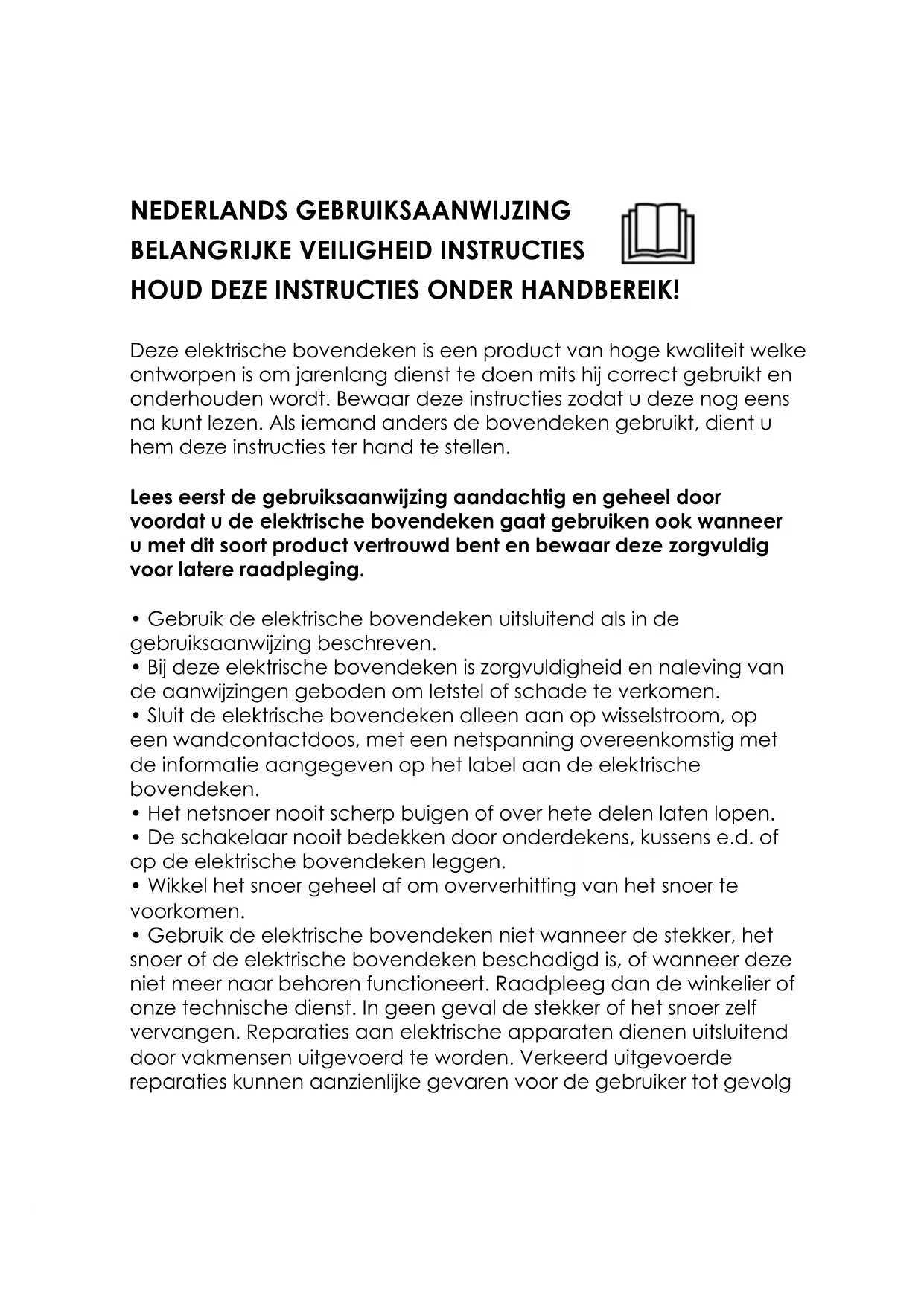 Deze elektrische bovendeken is een product van hoge kwaliteit welke ontworpen is om jarenlang Dienst te doein mits hij correct gebruikt en onderhoden worden. Bewaar deze instructies zodate u deze nog eens na=kunt lezen. Als iemand anders de bovendeken gebruikt, dient u hem deze instructies ter hand te stellen.