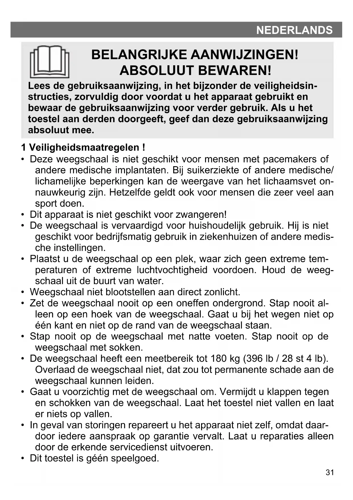 - De weegschaal heeft een meetbereik tot 180 kg (396 lb / 28 st 4 lb). Overlaad de weegschaal niet, dat zou tot permanente schade aan de weegschaal kunnen leiden.