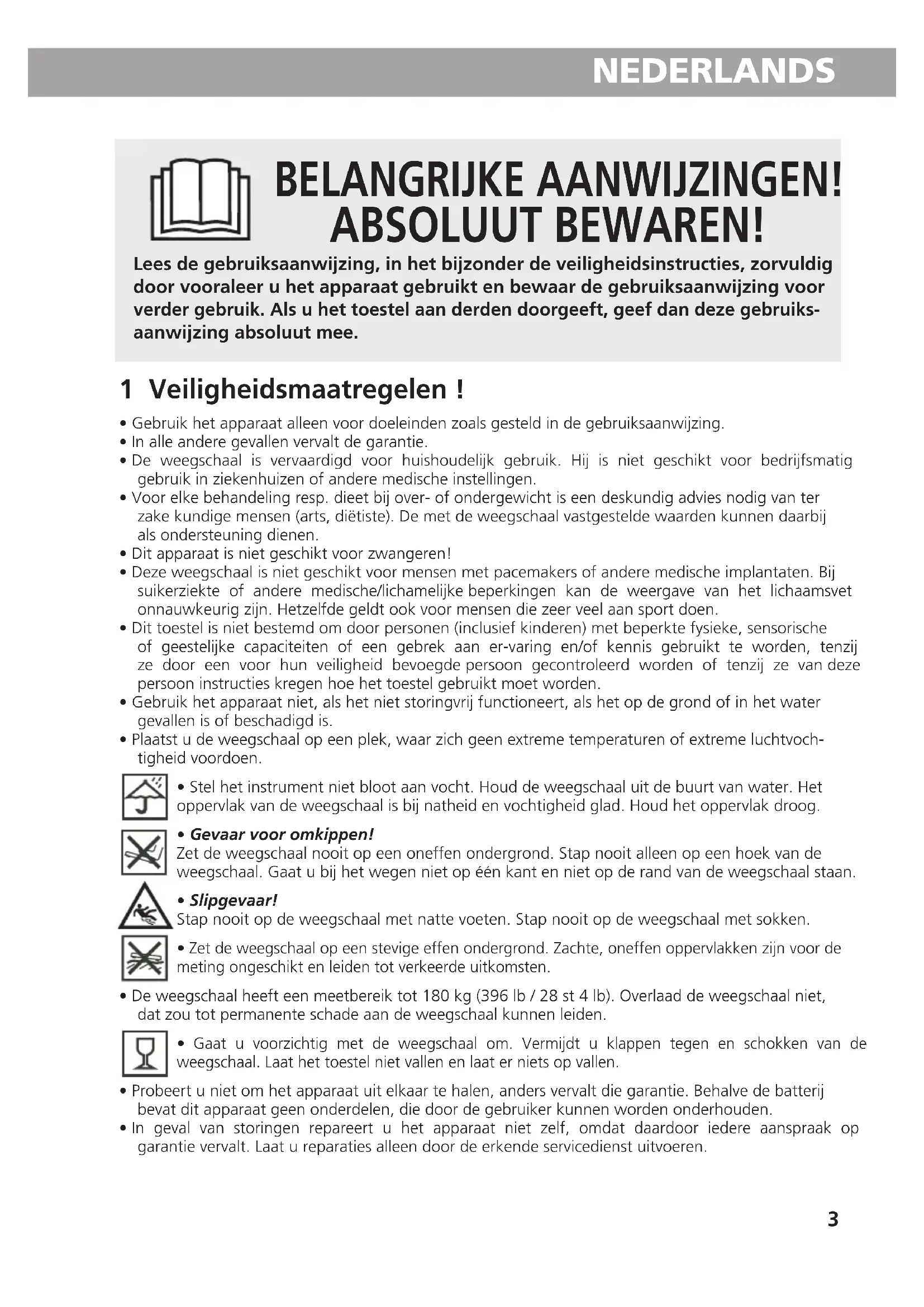 - Gaat u voorzichtig met de weegschaal om. Vermijdt u klappen tegen en schokken van de weegschaal. Laat het toestel niet vallen en laat er niets op vallen.