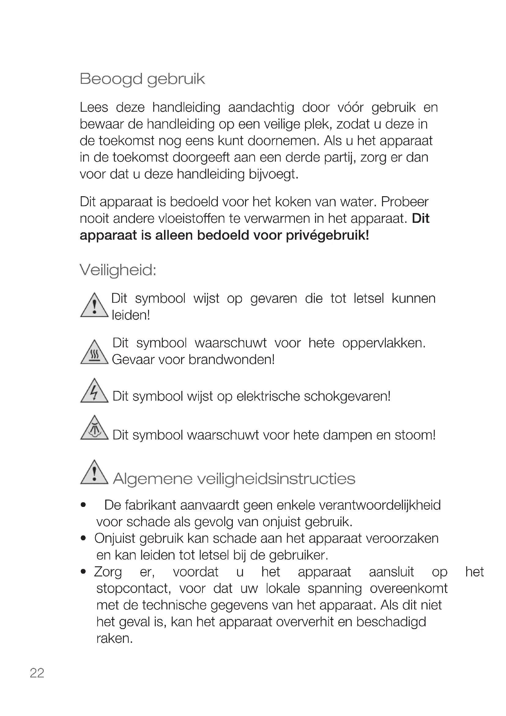 - fordamagescausedbyowner This guarantee does not affect your statutory right, nor any legal right you may have as a costumer under applicable national legislation governing the purchase of goods. Inordertoasserthis/herrightinaguaranteecaseduringthe guaranteed period, the customer must provide evidence of thedateofpurchase(receipt). The guarantee is to be asserted against KORONA electric GmbH, Sundern/Germany. Service Address: KORONA Service, Am Steinbach 9, 59872 Meschede, Germany Telephone Hotline: 02933 90284-80 Mail: service@korona-electric.de web: www.korona-electric.de within 2 years after the date of purchase. In case of guarantee the customer is given the right to get the appliance repaired atourownoratanauthorizedshop.Furtherrights(dueto guaranteecase)arenotgiventothecustomer.22 Beoogd gebruik Lees deze handleiding aandachtig door vóór gebruik en bewaar de handleiding op een veilige plek, zodat u deze in de toekomst nog eens kunt doornemen. Als u het apparaat in de toekomst doorgeeft aan een derde partij, zorg er dan voor dat u deze handleiding bijvoegt. Dit apparaat is bedoeld voor het koken van water. Probeer nooit andere vloeistoffen te verwarmen in het apparaat. Dit apparaat is alleen bedoeld voor privégebruik! Veiligheid: Dit symbool wijst op gevaren die tot letsel kunnen leiden! Dit symbool waarschuwt voor hete oppervlakken. Gevaar voor brandwonden! Dit symbool wijst op elektrische schokgevaren! Dit symbool waarschuwt voor hete dampen en stoom! Algemene veiligheidsinstructies