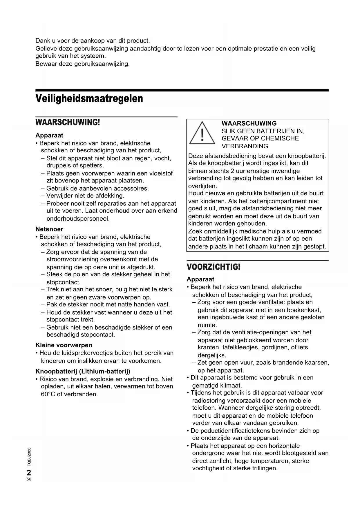 TQBJ2088_NL.fm Dank u voor de aankoop van dit product. Gelieve deze gebruiksaanwijzing aandachtig door te lezen voor een optimale prestatie en een veilig gebruik van het systeem. Bewaar deze gebruiksaanwijzing. Veiligheidsmaatregelen WAARSCHUWING! Apparaat