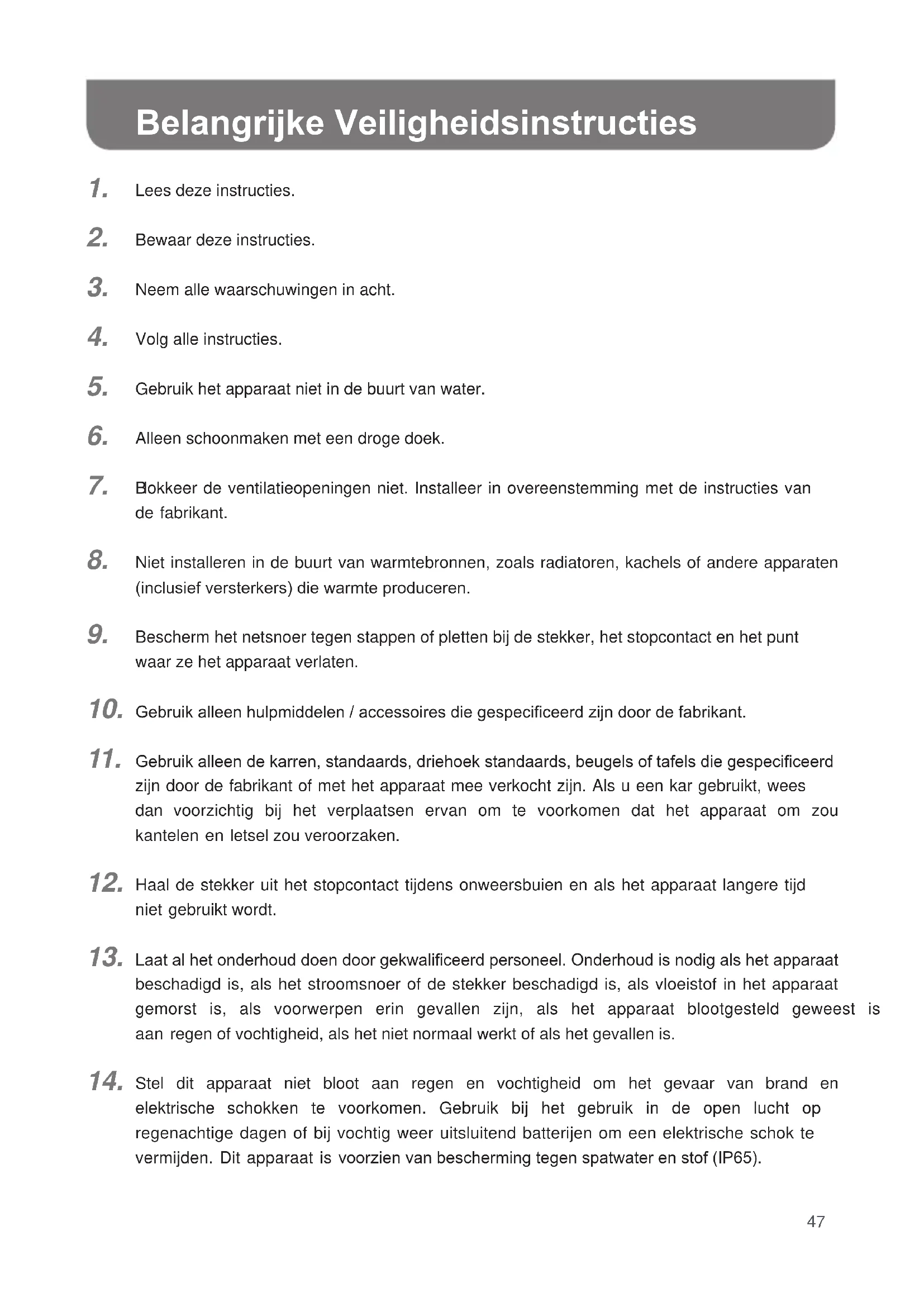 markering en logo’s zijn geregistreerde handelsmerken die eigendom zijn van Bluetooth SIG, Inc. en elk gebruik van deze markering en logo’s is onder licentie. WAARSCHUWING! DE GARANTIE VERVALT INDIEN DE BEHUIZING VAN HET APPARAAT GEOPEND IS OF INDIEN HET APPARAAT DOOR DE EINDGEBRUIKER OP ENIGERLEI WIJZE GEMODIFICEERD OF VERANDERD IS! OPEN NOOIT DE BEHUIZING. DE PRODUCENT AANVAART GEEN AANSPRAKELIJKHEID VOOR SCHADE EN/OF LETSEL VEROORZAAKT DOOR ONJUIST GEBRUIK. HET TYPEPLAATJE VINDT U OP DE ACHTERZIJDE VAN HET APPARAAT. WAARSCHUWING47 Belangrijke Veiligheidsinstructies Lees deze instructies. Bewaar deze instructies. Neem alle waarschuwingen in acht. Volg alle instructies. Gebruik het apparaat niet in de buurt van water. Alleen schoonmaken met een droge doek.
