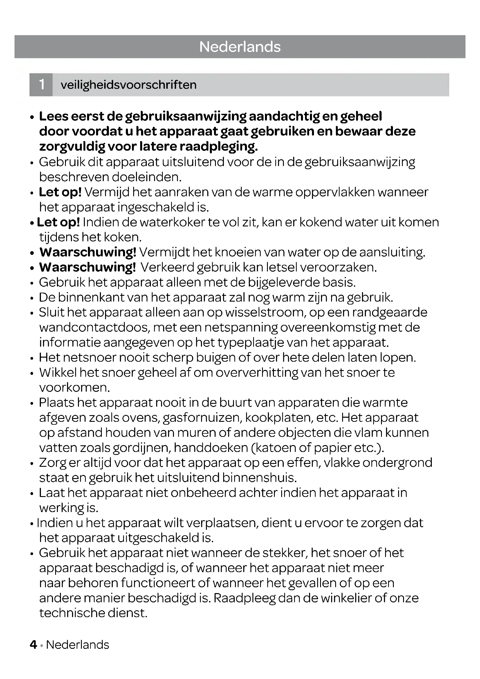 De waterkoker is uitsluitend geschikt voor het koken van water. Vul de waterkoker nooit met melk, thee, koffie of andere instant dranken.