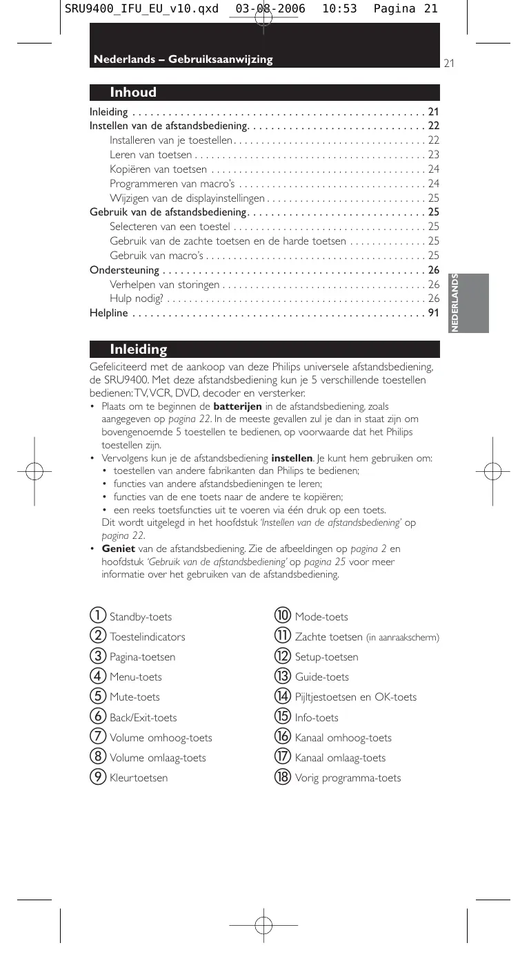 - Geniet van de afstandsbediening. Zie de afbeeldingen op pagina 2 en hoofdstuk ‘Gebruik van de afstandsbediening’ op pagina 25 voor meer informatie over het gebruiken van de afstandsbediening. Standby-toets Toestelindicators Pagina-toetsen Menu-toets Mute-toets Back/Exit-toets Volume omhoog-toets Volume omlaag-toets Kleurtoetsen Mode-toets Zachte toetsen (in aanraakscherm) Setup-toetsen Guide-toets Pijltjestoetsen en OK-toets Info-toets Kanaal omhoog-toets Kanaal omlaag-toets Vorig programma-toets NEDERLANDS Inhoud SRU9400_IFU_EU_v10.qxd 03-08-2006 10:53 Pagina 22