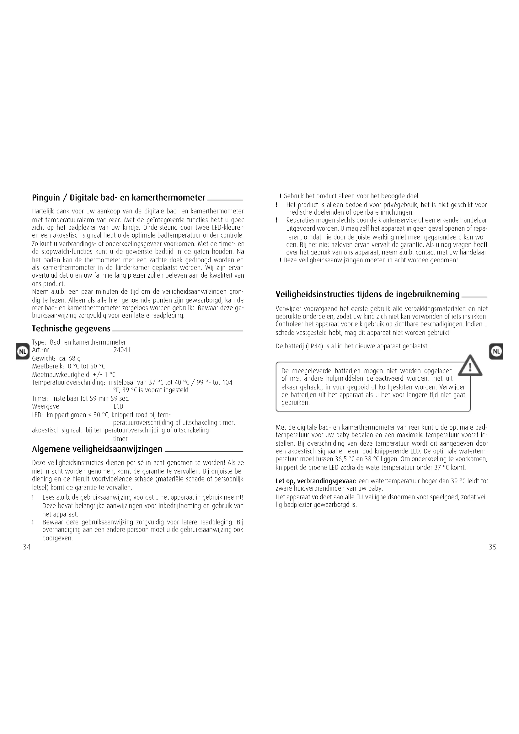 Neem a.u.b. een pau minuten de lijd om de veiligheidsaanwijzingen grondig te lezen. Alleen als alle hier genoemde punten zijn gewaarborgd, kan de reer bad- en kamerthermometer zorgeloos worden gebruikt. Bewaar deze gebruiksaanwijzing zorgvuldig voor een latere raadpleging.