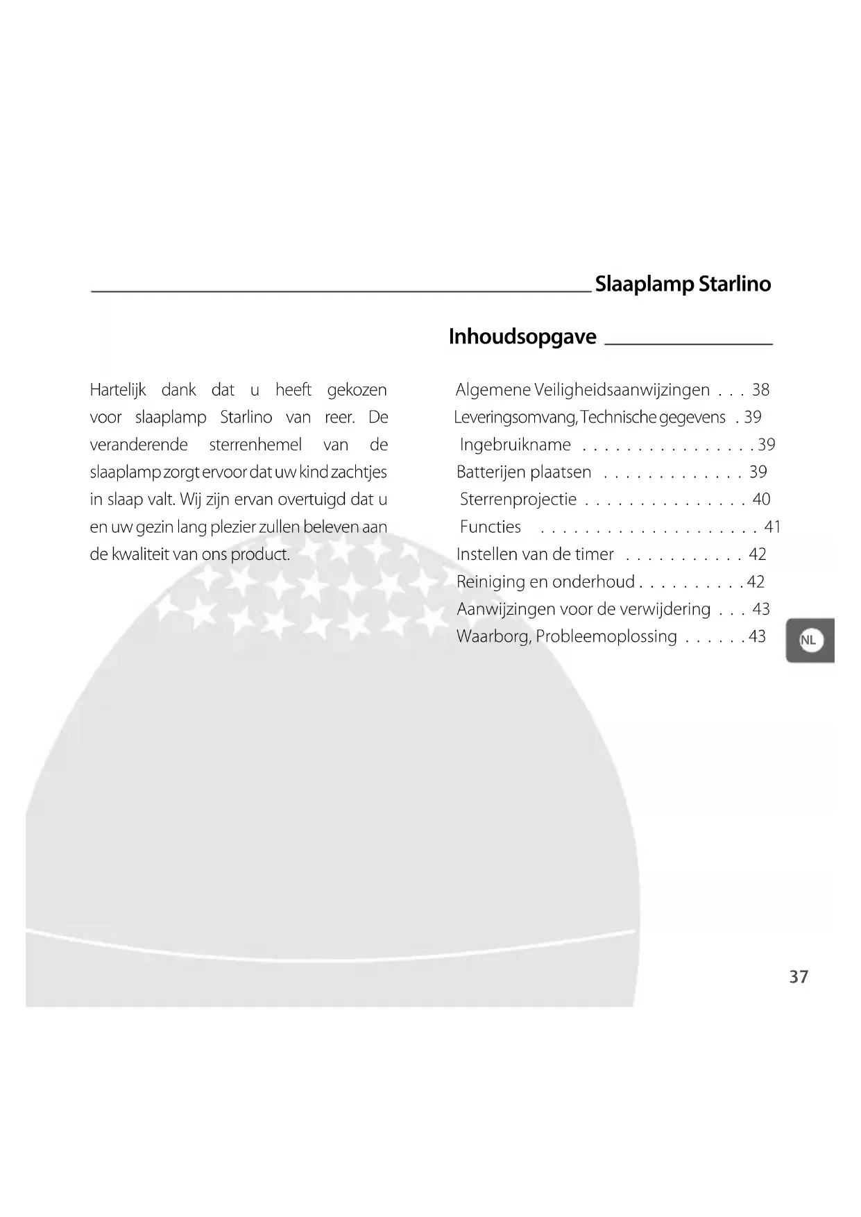 Hartelijk dank dat u heeft gekozen voor slaaplamp Starlino van reer. De veranderende sterrenhemel van de slaaplamp zorgt ervoor dat uw kind zachtjes in slaap valt. Wij zijn ervan overtuigd dat u en uw gezin lang plezier zullen beleven aan de kwaliteit van ons product.