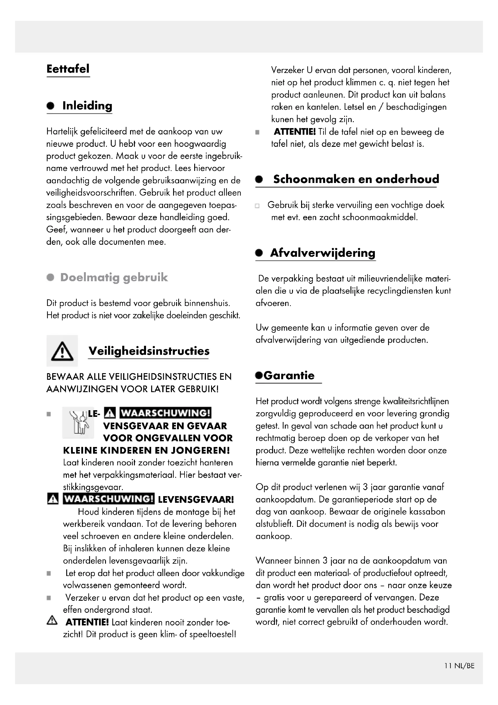 KLEINE KINDEREN EN JONGEREN! Laat kinderen nooit zonder toezicht hanteren met het verpakkingsmateriaal. Hier bestaat ver- stikkingsgevaar. LEVENSGEVAAR! Houd kinderen tijdens de montage bij het werkbereik vandaan. Tot de levering behoren veel schroeven en andere kleine onderdelen. Bij inslikken of inhaleren kunnen deze kleine onderdelen levensgevaarlijk zijn. Let erop dat het product alleen door vakkundige volwassenen gemonteerd wordt. Verzeker u ervan dat het product op een vaste, effen ondergrond staat. ATTENTIE! Laat kinderen nooit zonder toe- zicht! Dit product is geen klim- of speeltoestel! Verzeker U ervan dat personen, vooral kinderen, niet op het product klimmen c. q. niet tegen het product aanleunen. Dit product kan uit balans raken en kantelen. Letsel en / beschadigingen kunen het gevolg zijn. ATTENTIE! Til de tafel niet op en beweeg de tafel niet, als deze met gewicht belast is. Schoonmaken en onderhoud Gebruik bij sterke vervuiling een vochtige doek met evt. een zacht schoonmaakmiddel. Afvalverwijdering De verpakking bestaat uit milieuvriendelijke materi- alen die u via de plaatselijke recyclingdiensten kunt afvoeren. Uw gemeente kan u informatie geven over de afvalverwijdering van uitgediende producten. Garantie Het product wordt volgens strenge kwaliteitsrichtlijnen zorgvuldig geproduceerd en voor levering grondig getest. In geval van schade aan het product kunt u rechtmatig beroep doen op de verkoper van het product. Deze wettelijke rechten worden door onze hierna vermelde garantie niet beperkt. Op dit product verlenen wij 3 jaar garantie vanaf aankoopdatum. De garantieperiode start op de dag van aankoop. Bewaar de originele kassabon alstublieft. Dit document is nodig als bewijs voor aankoop. Wanneer binnen 3 jaar na de aankoopdatum van dit product een materiaal- of productiefout optreedt, dan wordt het product door ons – naar onze keuze – gratis voor u gerepareerd of vervangen. Deze garantie komt te vervallen als het product beschadigd wordt, niet correct gebruikt of onderhouden wordt.12 NL/BE De garantie geldt voor materiaal- en productiefouten. Deze garantie is niet van toepassing op producton- derdelen, die onderhevig zijn aan normale slijtage en hierdoor als aan slijtage onderhevige onderde- len gelden (bijv. batterijen) of voor beschadigingen aan breekbare onderdelen, zoals bijv. schakelaars, accu’s of dergelijke onderdelen, die gemaakt zijn van glas.13 CZ Jídelní stůl Úvod Blahopřejeme Vám ke koupi nového výrobku. Roz- hodli jste se pro kvalitní výrobek. Před prvním uve- dením do provozu se seznamte s výrobkem. K tomu si pozorně přečtěte následující návod k obsluze a bezpečnostní pokyny. Používejte výrobek jen po- psaným způsobem a pouze pro uvedené oblasti použití. Uschovejte si, prosím, tento návod. Všechny podklady vydejte při předání výrobku i třetí osobě. Použití ke stanovenému účelu Tento výrobek je určen jen pro uzavřené prostory. Výrobek není určen ke komerčnímu využívání. Bezpečnostní pokyny