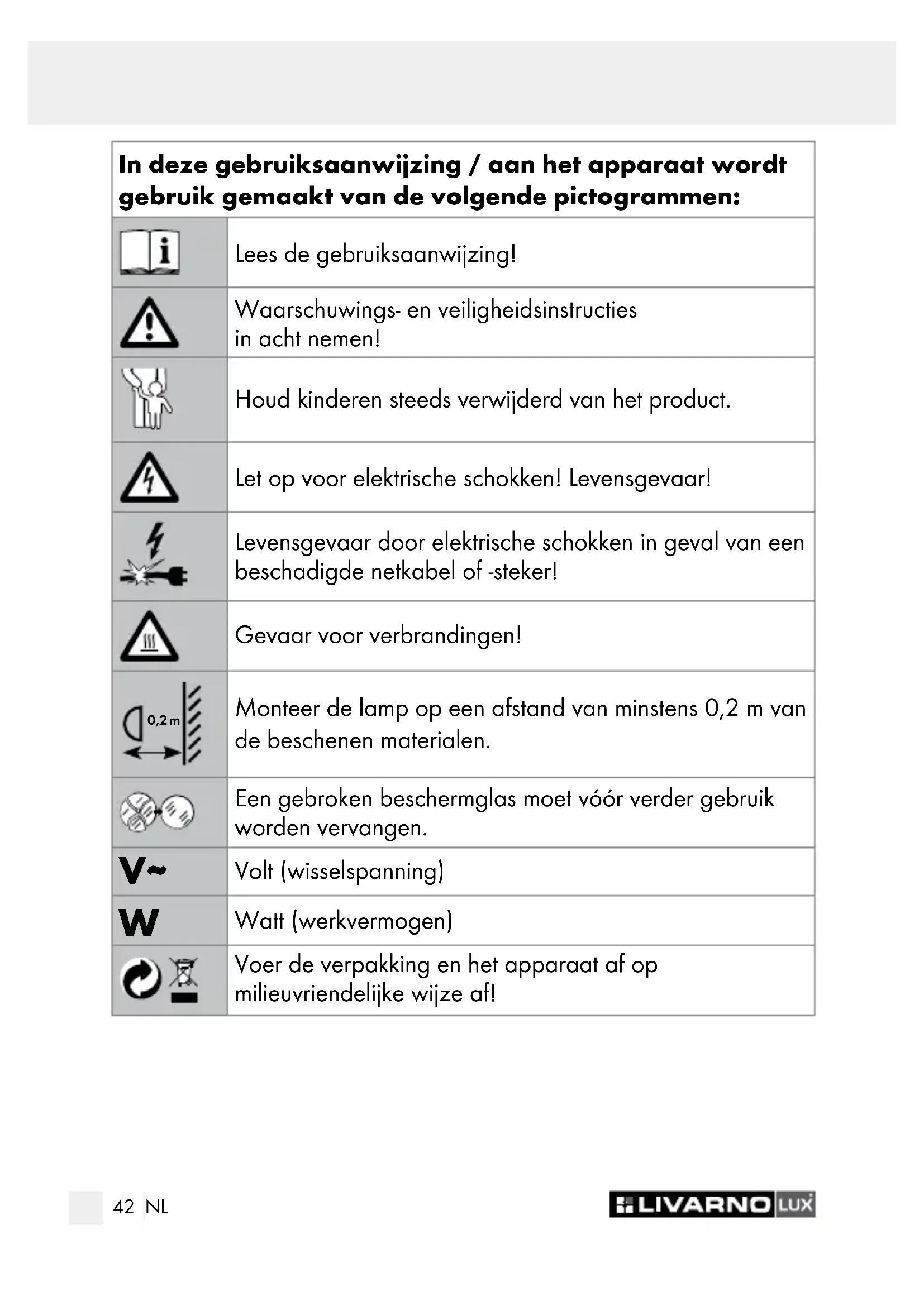 Vermijd brand- en verwondingsgevaar GEVAAR VOOR LETSEL! Controleer na het uitpakken elke gloeilamp en elk lampglas onmiddellijk op schade. Gebruik de lamp niet met een defect lampglas. Neem in dit geval voor vervangende levering contact op met de klantenservice. GEVAAR VOOR VERBRANDING! Voorkom brandwonden en waarborg dat de lamp uitgeschakeld en afgekoeld is voordat u hem aanraakt. Gloeilampen ontwikkelen een grote hitte. Vervang defecte gloeilampen onmiddellijk door nieuwe. Trek altijd eerst de netsteker uit de contactdoos voordat u de gloeilamp vervangt. Laat de lamp minimaal 15 minuten afkoelen voordat u de defecte gloeilamp vervangt. 0,2 m BRANDGEVAAR! Waarborg dat de afstand tussen de lamp en andere inrichtingsvoorwerpen min. 0,2 m bedraagt.47 NL Veiligheidsinstructies / Bediening Dek de lamp niet af met voorwerpen! Overmatige warmteontwik- keling kan tot brand leiden. Plaats de lamp zodanig dat hij beschermd wordt tegen vocht en verontreiniging. Laat de lamp tijdens het gebruik niet zonder toezicht. Gebruik alléén het aangegeven lamptype.
