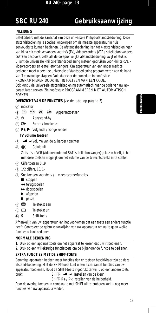Gefeliciteerd met de aanschaf van deze universele Philips-afstandsbediening. Deze afstandsbediening is speciaal ontworpen om de meeste apparatuur in huis eenvoudig te kunnen bedienen. De afstandsbediening kan tot 4 afstandsbedieningen van bijna elk merk vervangen voor tv’s (TV), videorecorders (VCR), satellietontvangers (SAT) en decoders, zelfs als de oorspronkelijke afstandsbediening kwijt of stuk is. U kunt de universele Philips-afstandsbediening meteen gebruiken voor Philips-tv’s, videorecorders en -satellietontvangers. Om apparatuur van een ander merk te bedienen moet u eerst de universele afstandsbediening programmeren aan de hand van 3 eenvoudige stappen. Volg daarvoor de procedure in hoofdstuk: PROGRAMMEREN DOOR HET INTOETSEN VAN EEN CODE. Ook kunt u de universele afstandsbediening automatisch naar de code van uw apparaat laten zoeken. Zie hoofdstuk: PROGRAMMEREN MET AUTOMATISCH ZOEKEN OVERZICHT VAN DE FUNCTIES (zie de tabel op pagina 3) A indicator B TV VCR SAT AUX Apparaattoetsen C y Aan/stand-by D † Extern / bronkeuze E P+, P- Volgende / vorige zender TV volume toetsen F Volume van de tv harder / zachter G c Geluid uit Zelfs als u VCR (videorecorder) of SAT (satellietontvanger) gekozen heeft, is het met deze toetsen mogelijk om het volume van de tv rechtstreeks in te stellen. H Cijfertoetsen 0...9 I 1/2 cijfers, 10, 1J Sneltoetsen voor de tv / videorecorderfuncties 9 stoppen 5 terugspoelen 6 doorspoelen 2 afspelen ; pauze K b Teletekst aan L I Teletekst uit M S Shift-toets Afhankelijk van uw apparatuur kan het voorkomen dat een toets een andere functie heeft. Controleer de gebruiksaanwijzing van uw apparatuur om na te gaan welke functies u kunt bedienen. NORMALE BEDIENING 1. Druk op een apparaattoets om het apparaat te kiezen dat u wilt bedienen. 2. Druk op een willekeurige functietoets om de bijbehorende functie te bedienen. EXTRA FUNCTIES MET DE SHIFT-TOETS Sommige apparaten hebben meer functies dan er toetsen beschikbaar zijn op deze afstandsbediening. Met de SHIFT-toets kunt u een extra aantal functies van uw apparatuur bedienen. Houd de SHIFT-toets ingedrukt terwijl u op een andere toets drukt: SHIFT: Instellen van de kleur SHIFT- P+ / P-: Instellen van de helderheid. Door de overige toetsen in combinatie met SHIFT uit te proberen kunt u nog meer functies van uw apparatuur vinden. 13