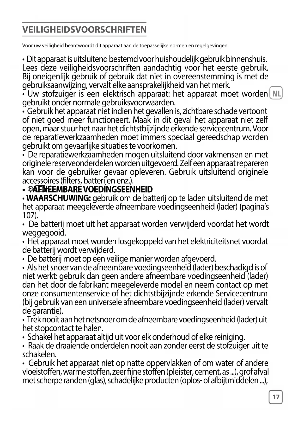 - Gebruik het apparaat niet op natte oppervlakken of om water of andere vloeistoen, warme stoen, zeer jne stoen (pleister, cement, as ...), grof afval met scherpe randen (glas), schadelijke producten (oplos- of afbijtmiddelen ...), NL18 agressieve producten (zuren, reinigingsmiddelen ...), brandbare en ontplofbare producten (op basis van benzine of alcohol) op te zuigen.