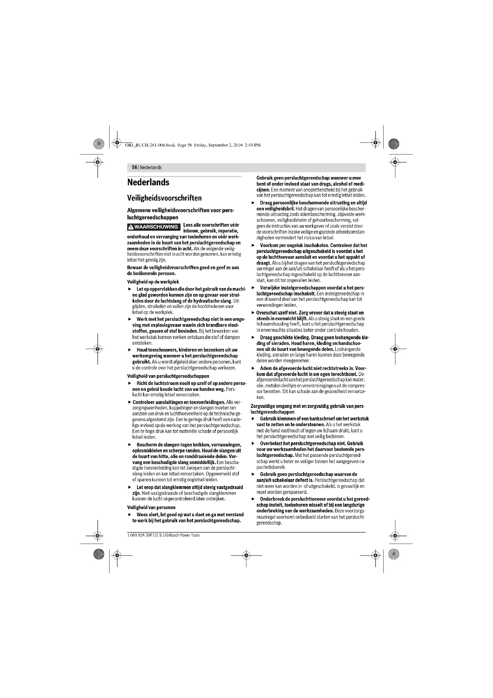 lbs 9,6 21,2 5,6 12,3 1,5 3,3 1,5 3,3 2,3 5,1 OBJ_BUCH-281-006.book Page 59 Friday, September 2, 2016 2:45 PM60 | Nederlands 1 609 92A 39P | (2.9.16) Bosch Power Tools Informatie over geluid en trillingen Het in deze gebruiksaanwijzing vermelde trillingsniveau is gemeten met een volgens EN ISO 11148 genormeerde meetmethode en kan worden gebruikt om persluchtgereedschappen met elkaar te vergelijken. Het is ook geschikt voor een voorlopige inschat- ting van de trillingsbelasting. Het aangegeven trillingsniveau representeert de voornaamste toepassingen van het persluchtgereedschap. Als echter het pers- luchtgereedschap wordt gebruikt voor andere toepassingen, met verschillende accessoire, met afwijkende inzetgereedschap- pen of onvoldoende onderhoud, kan het trillingsniveau afwijken. Dit kan de trillingsbelasting gedurende de gehele arbeidsperi- ode duidelijk verhogen. Voor een nauwkeurige schatting van de trillingsbelasting moet ook rekening worden gehouden met de tijd waarin het perslucht- gereedschap uitgeschakeld is, of waarin het gereedschap wel loopt, maar niet werkelijk wordt gebruikt. Dit kan de trillingsbelas- ting gedurende de gehele arbeidsperiode duidelijk verminderen. Leg aanvullende veiligheidsmaatregelen ter bescherming van de bediener tegen het effect van trillingen vast, zoals: Onderhoud van persluchtgereedschappen en inzetgereedschappen, warm houden van de handen, organisatie van het arbeidsproces. Conformiteitsverklaring We verklaren op onze verantwoordelijkheid dat het onder „Technische gegevens” beschreven product aan alle desbe- treffende bepalingen van de richtlijn 2006/42/EG inclusief van de wijzigingen ervan voldoet en met de volgende normen overeenstemt: EN ISO 11148-6. Technisch dossier (2006/42/EG) bij: Robert Bosch Power Tools GmbH, PT/ECS, 70538 Stuttgart, GERMANY Robert Bosch Power Tools GmbH 70538 Stuttgart, GERMANY Stuttgart, 01.01.2017 Montage Voorzieningen voor veilige toepassing Als u het persluchtgereedschap in een ophang- of op- spanvoorziening wilt gebruiken, dient u erop te letten dat u het eerst in de voorziening bevestigt voordat u het op de persluchttoevoer aansluit. Daardoor voort- komt u dat u het gereedschap per ongeluk inschakelt. Ophangvoorziening Met het ophangoog 4 (0 607 450 593) of de ophangbeugel 14 (0 607 450 622) kunt u het persluchtgereedschap aan een ophanginrichting bevestigen. Controleer regelmatig de toestand van het ophangoog of de ophangbeugel en de haak in de ophanginrichting. Ophangbeugel bevestigen (0 607 450 622) (zie afbeelding A) – Schroef de bovenste, voorste schroeven 12 met een in- bussleutel (6 mm) tegen de klok in van de behuizing van het persluchtgereedschap. – Verwijder de onderlegschijven 13 en steek ze op de schroeven 12. – Schroef de ophangbeugel 14 met de schroeven en de on- derlegschijven met de klok mee aan de behuizing van het persluchtgereedschap vast. Productnummer 0 607 450 ....... 593 ... 622 ... 626 ... 627 ... 628 Geluidsemissiewaarden vastgesteld volgens EN ISO 15744. Het A-gewogen geluidsniveau van het perslucht- gereedschap bedraagt kenmerkend: Geluidsdrukniveau L