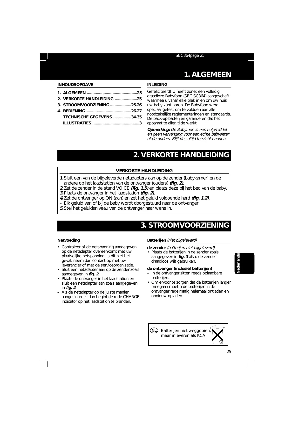 - Gefeliciteerd! U heeft zonet een volledig draadloze Babyfoon (SBC SC364) aangeschaft waarmee u vanaf elke plek in en om uw huis uw baby kunt horen. De Babyfoon werd speciaal getest om te voldoen aan alle noodzakelijke reglementeringen en standaards. De back-up-batterijen garanderen dat het apparaat te allen tijde werkt. ALGEMEEN p. 25