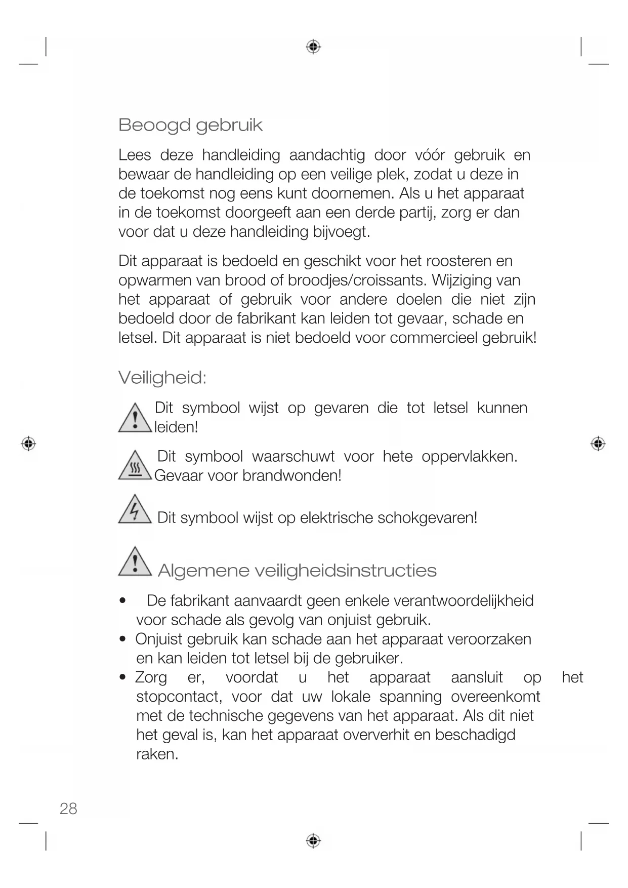 - fordamagescausedbyowner This guarantee does not affect your statutory right, nor any legal right you may have as a costumer under applicable national legislation governing the purchase of goods. Inordertoasserthis/herrightinaguaranteecaseduringthe guaranteed period, the customer must provide evidence of the date of purchase (receipt). The guarantee is to be asserted against KORONA electric GmbH, Sundern/Germany. Service Address: KORONA Service, Am Steinbach 9, 59872 Meschede, Germany Telephone Hotline: 02933 90284-80 Mail: service@korona-electric.de web: www.korona-electric.de within 2 years after the date of purchase. In case of guarantee the customer is given the right to get the appliance repaired at our own or at an authorized shop. Further rights (due to guarantee case) are not given to the customer.28 Beoogd gebruik Lees deze handleiding aandachtig door vóór gebruik en bewaar de handleiding op een veilige plek, zodat u deze in de toekomst nog eens kunt doornemen. Als u het apparaat in de toekomst doorgeeft aan een derde partij, zorg er dan voor dat u deze handleiding bijvoegt. Dit apparaat is bedoeld en geschikt voor het roosteren en opwarmenvanbroodofbroodjes/croissants.Wijzigingvan het apparaat of gebruik voor andere doelen die niet zijn bedoeld door de fabrikant kan leiden tot gevaar, schade en letsel. Dit apparaat is niet bedoeld voor commercieel gebruik! Veiligheid: Dit symbool wijst op gevaren die tot letsel kunnen leiden! Dit symbool waarschuwt voor hete oppervlakken. Gevaar voor brandwonden! Dit symbool wijst op elektrische schokgevaren! Algemene veiligheidsinstructies