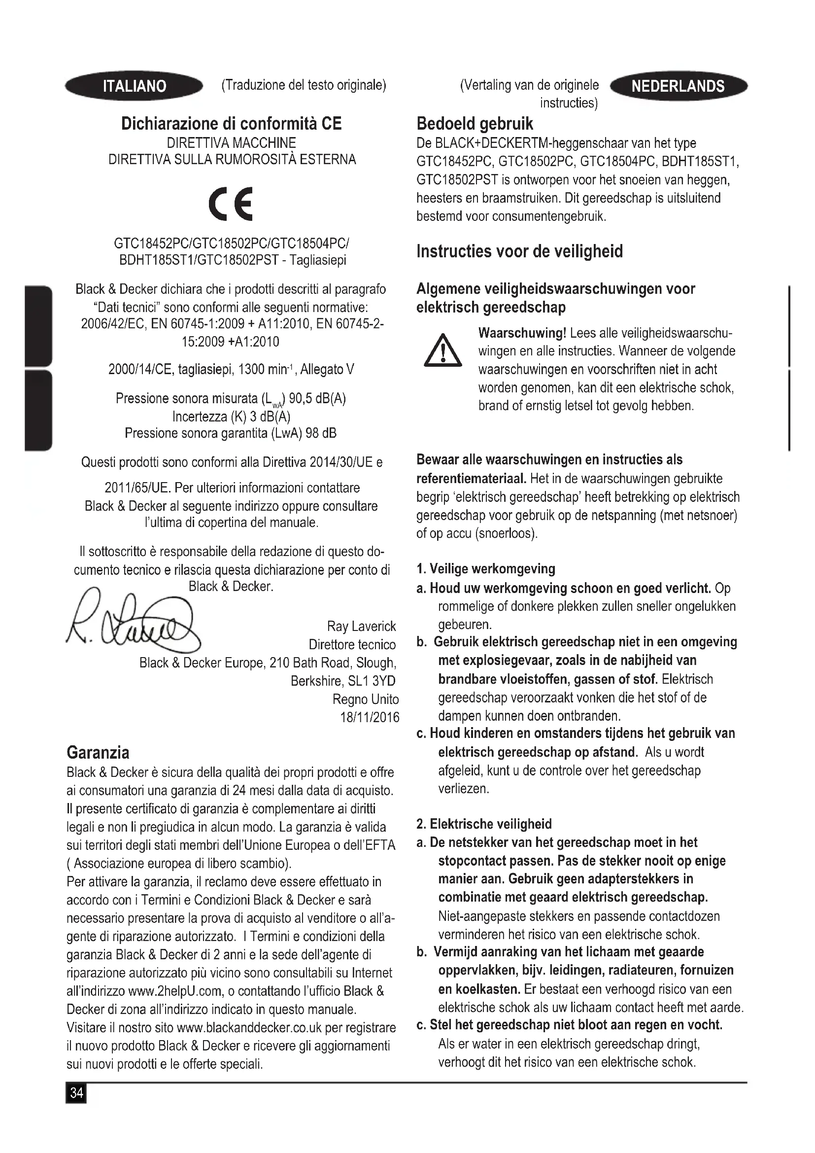 ) 90,5 dB(A) Meetonzekerheid (K) 3 dB(A) Gegarandeerd geluidsvermogen (LwA) 98 dB Deze producten voldoen tevens aan richtlijn 2014/30/EU en 2011/65/EU. Neem voor meer informatie contact op met Black & Decker op het volgende adres of raadpleeg de achterzijde van de handleiding. Ondergetekende is verantwoordelijk voor de samenstelling van het technische bestand en legt deze verklaring af namens Black & Decker. Ray Laverick Director of Engineering Black & Decker Europe, 210 Bath Road, Slough, Berkshire, SL1 3YD Verenigd Koninkrijk 18/11/2016 Garantie Black & Decker heeft vertrouwen in zijn producten en biedt consumenten een garantie van 24 maanden vanaf de aankoopdatum. Deze garantie vormt een aanvulling op uw wettelijke rechten en beperken deze niet. De garantie is geldig op het grondgebied van de Lidstaten van de Europese Unie en de Europese Vrijhandelszone. Voor een garantie-aanspraak moet uw aanspraak in overeenstemming zijn met de Voorwaarden en Condities van Black&Decker en moet u een bewijs van aankoop overleggen aan de verkoper of aan een geautoriseerde reparatiemonteur. Voorwaarden en condities van de 2-jarige garantie van Black&Decker en het adres van de vestiging van het geautoriseerde reparatiecentrum bij u in de buurt, kunt u vinden op internet op www.2helpU.com, of door contact op te nemen met het Black & Decker-kantoor ter plaatse, op het adres dat in deze handleiding wordt vermeld. Bezoek onze website www.blackanddecker.nl, waar u uw nieuwe Black & Decker-product kunt registreren en informatie kunt verkrijgen over nieuwe producten en speciale aanbiedingen.43 (Traducción de las instrucciones originales) ESPAÑOL Uso previsto Los cortasetos BLACK+DECKERTM GTC18452PC, GTC18502PC, GTC18504PC, BDHT185ST1, GTC18502PST se han diseñado para cortar setos, arbustos y zarzas. Esta herramienta ha sido concebida únicamente para uso doméstico. Instrucciones de seguridad Advertencias de seguridad generales para herrami- entas eléctricas