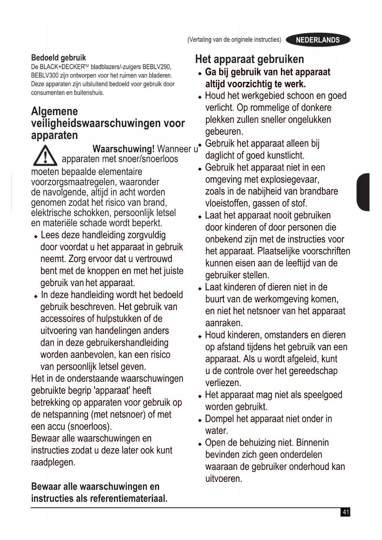 bladblazers/-zuigers BEBLV290, BEBLV300 zijn ontworpen voor het ruimen van bladeren. Deze apparaten zijn uitsluitend bedoeld voor gebruik door consumenten en buitenshuis. Algemene veiligheidswaarschuwingen voor apparaten Waarschuwing! Wanneer u apparaten met snoer/snoerloos moeten bepaalde elementaire voorzorgsmaatregelen, waaronder de navolgende, altijd in acht worden genomen zodat het risico van brand, elektrische schokken, persoonlijk letsel en materiële schade wordt beperkt. u Lees deze handleiding zorgvuldig door voordat u het apparaat in gebruik neemt. Zorg ervoor dat u vertrouwd bent met de knoppen en met het juiste gebruik van het apparaat. u In deze handleiding wordt het bedoeld gebruik beschreven. Het gebruik van accessoires of hulpstukken of de uitvoering van handelingen anders dan in deze gebruikershandleiding worden aanbevolen, kan een risico van persoonlijk letsel geven. Het in de onderstaande waarschuwingen gebruikte begrip 'apparaat' heeft betrekking op apparaten voor gebruik op de netspanning (met netsnoer) of met een accu (snoerloos). Bewaar alle waarschuwingen en instructies zodat u deze later ook kunt raadplegen. Bewaar alle waarschuwingen en instructies als referentiemateriaal. Het apparaat gebruiken u Ga bij gebruik van het apparaat altijd voorzichtig te werk. u Houd het werkgebied schoon en goed verlicht. Op rommelige of donkere plekken zullen sneller ongelukken gebeuren. u Gebruik het apparaat alleen bij daglicht of goed kunstlicht. u Gebruik het apparaat niet in een omgeving met explosiegevaar, zoals in de nabijheid van brandbare vloeistoffen, gassen of stof. u Laat het apparaat nooit gebruiken door kinderen of door personen die onbekend zijn met de instructies voor het apparaat. Plaatselijke voorschriften kunnen eisen aan de leeftijd van de gebruiker stellen. u Laat kinderen of dieren niet in de buurt van de werkomgeving komen, en niet het netsnoer van het apparaat aanraken. u Houd kinderen, omstanders en dieren op afstand tijdens het gebruik van een apparaat. Als u wordt afgeleid, kunt u de controle over het gereedschap verliezen. u Het apparaat mag niet als speelgoed worden gebruikt. u Dompel het apparaat niet onder in water. u Open de behuizing niet. Binnenin bevinden zich geen onderdelen waaraan de gebruiker onderhoud kan uitvoeren.42 (Vertaling van de originele instructies) NEDERLANDS Persoonlijke veiligheid u Blijf alert, let goed op wat u doet en gebruik uw gezond verstand bij het gebruik van een apparaat. Werk niet met een apparaat wanneer u moe bent of onder invloed van drugs, alcohol of medicijnen verkeert. Een moment van onoplettendheid bij het gebruik van een apparaat kan leiden tot ernstige verwondingen. u Draag, waar nodig, persoonlijke beschermende uitrusting. Het dragen van een persoonlijke beschermende uitrusting zoals een veiligheidsbril, een stofmasker, slipvaste werkschoenen, een veiligheidshelm of gehoorbescherming, afhankelijk van de aard en het gebruik van het apparaat, vermindert het risico van verwondingen. u Voorkom onbedoeld inschakelen. Controleer dat de schakelaar in de Uit- stand staat voordat u het gereedschap aansluit op het stopcontact en/of de accu plaats en voordat u het apparaat optilt of gaat dragen. Wanneer u bij het dragen van het apparaat uw vinger op de schakelaar houdt of wanneer u het apparaat per ongeluk inschakelt, kan dat tot ongevallen leiden. u Reik niet buiten uw macht. Blijf altijd stevig en in balans op de grond staan. Daardoor kunt u het apparaat beter onder controle houden in onverwachte situaties. u Draag de juiste kleding. Draag geen loszittende kleding of sieraden. Houd uw haar, kleding en handschoenen uit de buurt van bewegende onderdelen. Loszittende kleding, sieraden of lang haar kunnen door bewegende delen worden gegrepen. Gebruik en onderhoud van het apparaat u Controleer het apparaat vóór gebruik op beschadigde en defecte onderdelen. Controleer het apparaat op gebroken onderdelen, schade aan de schakelaars en andere omstandigheden die de werking ervan kunnen beïnvloeden. u Gebruik het apparaat niet als de schakelaar defect is. Een apparaat dat niet meer met de schakelaar kan worden in- of uitgeschakeld, is gevaarlijk en moet worden gerepareerd. u Trek de stekker uit het stopcontact en/of haal de accu uit het apparaat voordat u het apparaat instelt, accessoires wisselt of het apparaat opbergt. Deze voorzorgsmaatregelen helpen onbedoeld starten van het apparaat voorkomen. u Houd zaag- en snijgereedschap, waar van toepassing, scherp en schoon. Goed onderhouden zaaggereedschap met scherpe snijvlakken loopt minder snel vast en is gemakkelijker onder controle te houden.43 (Vertaling van de originele instructies) NEDERLANDS u Gebruik het apparaat niet als een of meer onderdelen beschadigd of defect is. u Laat beschadigde of defecte onderdelen door een geautoriseerd servicecentrum repareren of vervangen. u Probeer nooit andere onderdelen te verwijderen of te vervangen dan de onderdelen die in deze handleiding worden genoemd. Elektrische veiligheid u De stekker van het apparaat moet in het stopcontact passen. Pas de stekker nooit op enige manier aan. Gebruik geen adapterstekkers in combinatie met geaarde apparaten. Niet-aangepaste stekkers en passende contactdozen verminderen het risico van een elektrische schok. u Stel het apparaat niet bloot aan regen of natte omstandigheden. Het binnendringen van water in een apparaat vergroot het risico van een elektrische schok. u Behandel het snoer voorzichtig. Gebruik het snoer niet om het apparaat te dragen of op te hangen of om de stekker uit het stopcontact te trekken. Houd het snoer uit de buurt van warmtebronnen, olie, scherpe randen, of bewegende onderdelen. Beschadigde snoeren of snoeren die in de war zijn geraakt, verhogen het risico van een elektrische schok. u Gebruik, wanneer u buitenshuis met een apparaat werkt, alleen verlengsnoeren die zijn goedgekeurd voor gebruik buitenshuis. Het gebruik van een verlengsnoer dat geschikt is voor buiten vermindert het