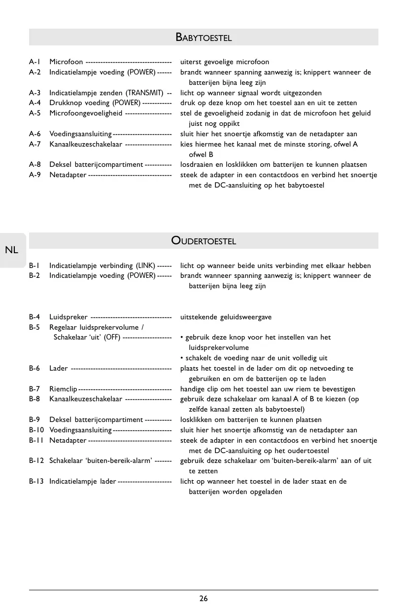 BABYTOESTEL A-1 A-2 Microfoon ----------------------------------Indicatielampje voeding (POWER) ------ A-3 A-4 A-5 Indicatielampje zenden (TRANSMIT) -Drukknop voeding (POWER) -----------Microfoongevoeligheid ------------------- A-6 A-7 Voedingsaansluiting -----------------------Kanaalkeuzeschakelaar ------------------- A-8 A-9 Deksel batterijcompartiment ----------Netadapter ---------------------------------- uiterst gevoelige microfoon brandt wanneer spanning aanwezig is; knippert wanneer de batterijen bijna leeg zijn licht op wanneer signaal wordt uitgezonden druk op deze knop om het toestel aan en uit te zetten stel de gevoeligheid zodanig in dat de microfoon het geluid juist nog oppikt sluit hier het snoertje afkomstig van de netadapter aan kies hiermee het kanaal met de minste storing, ofwel A ofwel B losdraaien en losklikken om batterijen te kunnen plaatsen steek de adapter in een contactdoos en verbind het snoertje met de DC-aansluiting op het babytoestel OUDERTOESTEL