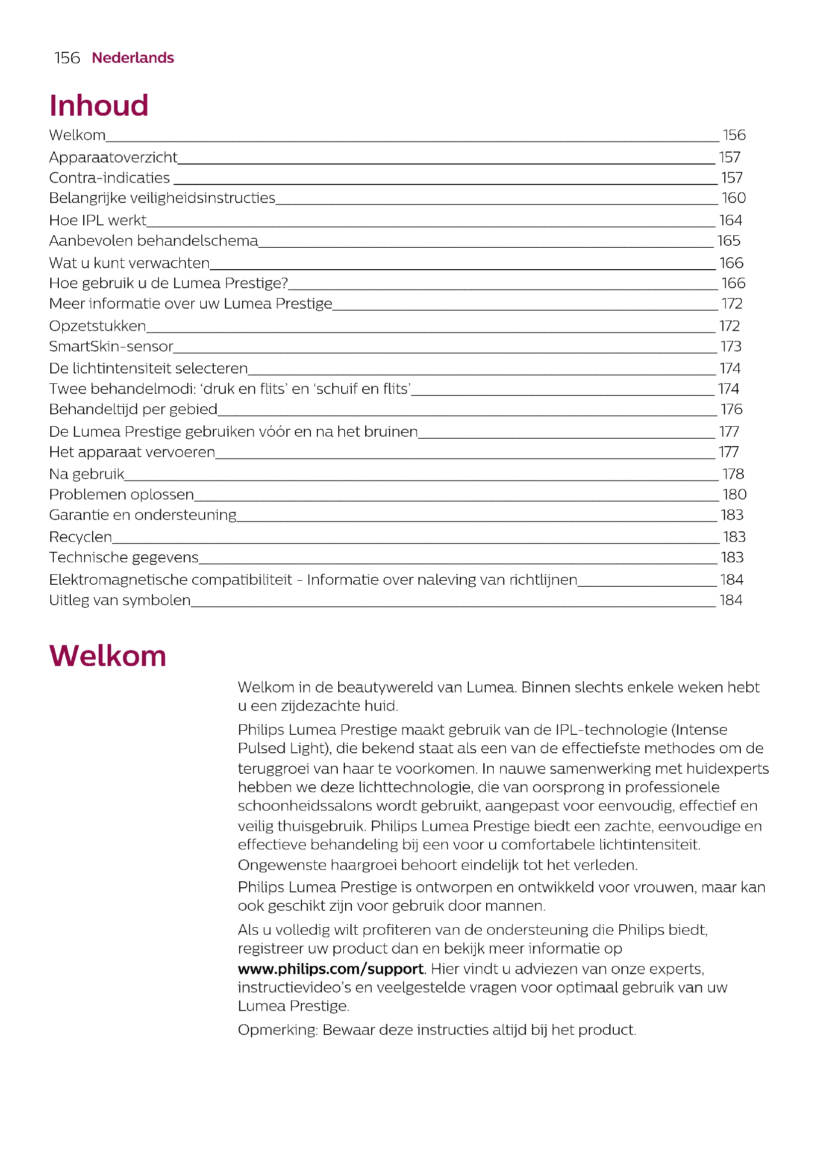 Nederlands Inhoud Welkom_________________________________________________________________________________________________ 156 Apparaatoverzicht_____________________________________________________________________________________ 157 Contra-indicaties ______________________________________________________________________________________ 157 Belangrijke veiligheidsinstructies______________________________________________________________________ 160 Hoe IPL werkt__________________________________________________________________________________________ 164 Aanbevolen behandelschema________________________________________________________________________ 165 Wat u kunt verwachten________________________________________________________________________________ 166 Hoe gebruik u de Lumea Prestige?____________________________________________________________________ 166 Meer informatie over uw Lumea Prestige_____________________________________________________________ 172 Opzetstukken__________________________________________________________________________________________ 172 SmartSkin-sensor______________________________________________________________________________________ 173 De lichtintensiteit selecteren__________________________________________________________________________ 174 Twee behandelmodi: ‘druk en flits’ en ‘schuif en flits’________________________________________________ 174 Behandeltijd per gebied_______________________________________________________________________________ 176 De Lumea Prestige gebruiken vóór en na het bruinen_______________________________________________ 177 Het apparaat vervoeren_______________________________________________________________________________ 177 Na gebruik______________________________________________________________________________________________ 178 Problemen oplossen___________________________________________________________________________________ 180 Garantie en ondersteuning____________________________________________________________________________ 183 Recyclen________________________________________________________________________________________________ 183 Technische gegevens__________________________________________________________________________________ 183 Elektromagnetische compatibiliteit - Informatie over naleving van richtlijnen______________________ 184 Uitleg van symbolen___________________________________________________________________________________ 184 Welkom Welkom in de beautywereld van Lumea. Binnen slechts enkele weken hebt u een zijdezachte huid. Philips Lumea Prestige maakt gebruik van de IPL-technologie (Intense Pulsed Light), die bekend staat als een van de effectiefste methodes om de teruggroei van haar te voorkomen. In nauwe samenwerking met huidexperts hebben we deze lichttechnologie, die van oorsprong in professionele schoonheidssalons wordt gebruikt, aangepast voor eenvoudig, effectief en veilig thuisgebruik. Philips Lumea Prestige biedt een zachte, eenvoudige en effectieve behandeling bij een voor u comfortabele lichtintensiteit. Ongewenste haargroei behoort eindelijk tot het verleden. Philips Lumea Prestige is ontworpen en ontwikkeld voor vrouwen, maar kan ook geschikt zijn voor gebruik door mannen. Als u volledig wilt profiteren van de ondersteuning die Philips biedt, registreer uw product dan en bekijk meer informatie op www.philips.com/support. Hier vindt u adviezen van onze experts, instructievideo’s en veelgestelde vragen voor optimaal gebruik van uw Lumea Prestige. Opmerking: Bewaar deze instructies altijd bij het product.157 Nederlands