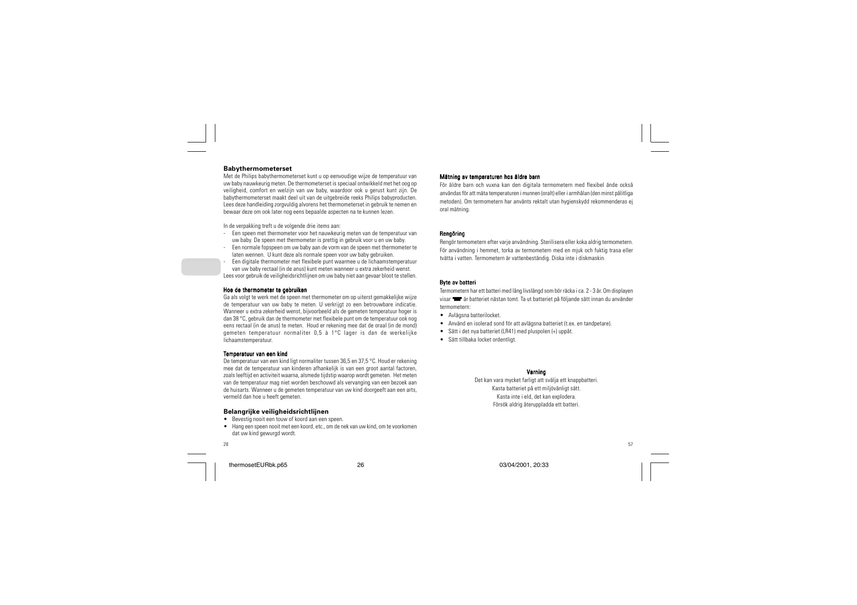 03/04/2001, 20:33 Babythermometerset Met de Philips babythermometerset kunt u op eenvoudige wijze de temperatuur van uw baby nauwkeurig meten. De thermometerset is speciaal ontwikkeld met het oog op veiligheid, comfort en welzijn van uw baby, waardoor ook u gerust kunt zijn. De babythermometerset maakt deel uit van de uitgebreide reeks Philips babyproducten. Lees deze handleiding zorgvuldig alvorens het thermometerset in gebruik te nemen en bewaar deze om ook later nog eens bepaalde aspecten na te kunnen lezen. In de verpakking treft u de volgende drie items aan: - Een speen met thermometer voor het nauwkeurig meten van de temperatuur van uw baby. De speen met thermometer is prettig in gebruik voor u en uw baby. - Een normale fopspeen om uw baby aan de vorm van de speen met thermometer te laten wennen. U kunt deze als normale speen voor uw baby gebruiken. - Een digitale thermometer met flexibele punt waarmee u de lichaamstemperatuur van uw baby rectaal (in de anus) kunt meten wanneer u extra zekerheid wenst. Lees voor gebruik de veiligheidsrichtlijnen om uw baby niet aan gevaar bloot te stellen. Hoe de ther mometer te gebr uiken thermometer gebruiken Ga als volgt te werk met de speen met thermometer om op uiterst gemakkelijke wijze de temperatuur van uw baby te meten. U verkrijgt zo een betrouwbare indicatie. Wanneer u extra zekerheid wenst, bijvoorbeeld als de gemeten temperatuur hoger is dan 38 °C, gebruik dan de thermometer met flexibele punt om de temperatuur ook nog eens rectaal (in de anus) te meten. Houd er rekening mee dat de oraal (in de mond) gemeten temperatuur normaliter 0,5 à 1°C lager is dan de werkelijke lichaamstemperatuur. Temperatuur van een kind De temperatuur van een kind ligt normaliter tussen 36,5 en 37,5 °C. Houd er rekening mee dat de temperatuur van kinderen afhankelijk is van een groot aantal factoren, zoals leeftijd en activiteit waarna, alsmede tijdstip waarop wordt gemeten. Het meten van de temperatuur mag niet worden beschouwd als vervanging van een bezoek aan de huisarts. Wanneer u de gemeten temperatuur van uw kind doorgeeft aan een arts, vermeld dan hoe u heeft gemeten. Mätning av temperatur en hos äldr temperaturen äldree bar barnn För äldre barn och vuxna kan den digitala termometern med flexibel ände också användas för att mäta temperaturen i munnen (oralt) eller i armhålan (den minst pålitliga metoden). Om termometern har använts rektalt utan hygienskydd rekommenderas ej oral mätning. Rengöring Rengör termometern efter varje användning. Sterilisera eller koka aldrig termometern. För användning i hemmet, torka av termometern med en mjuk och fuktig trasa eller tvätta i vatten. Termometern är vattenbeständig. Diska inte i diskmaskin. Byte av batteri Termometern har ett batteri med lång livslängd som bör räcka i ca. 2 - 3 år. Om displayen visar är batteriet nästan tomt. Ta ut batteriet på följande sätt innan du använder termometern:
