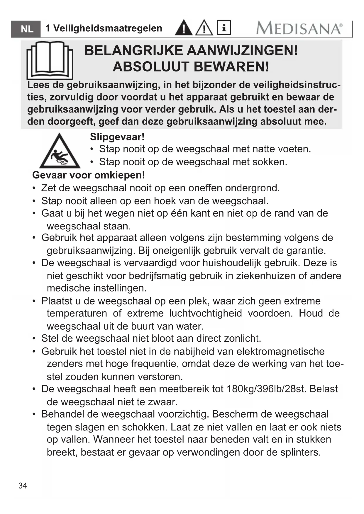 - Gaat u bij het wegen niet op één kant en niet op de rand van de weegschaal staan. 1 Veiligheidsmaatregelen