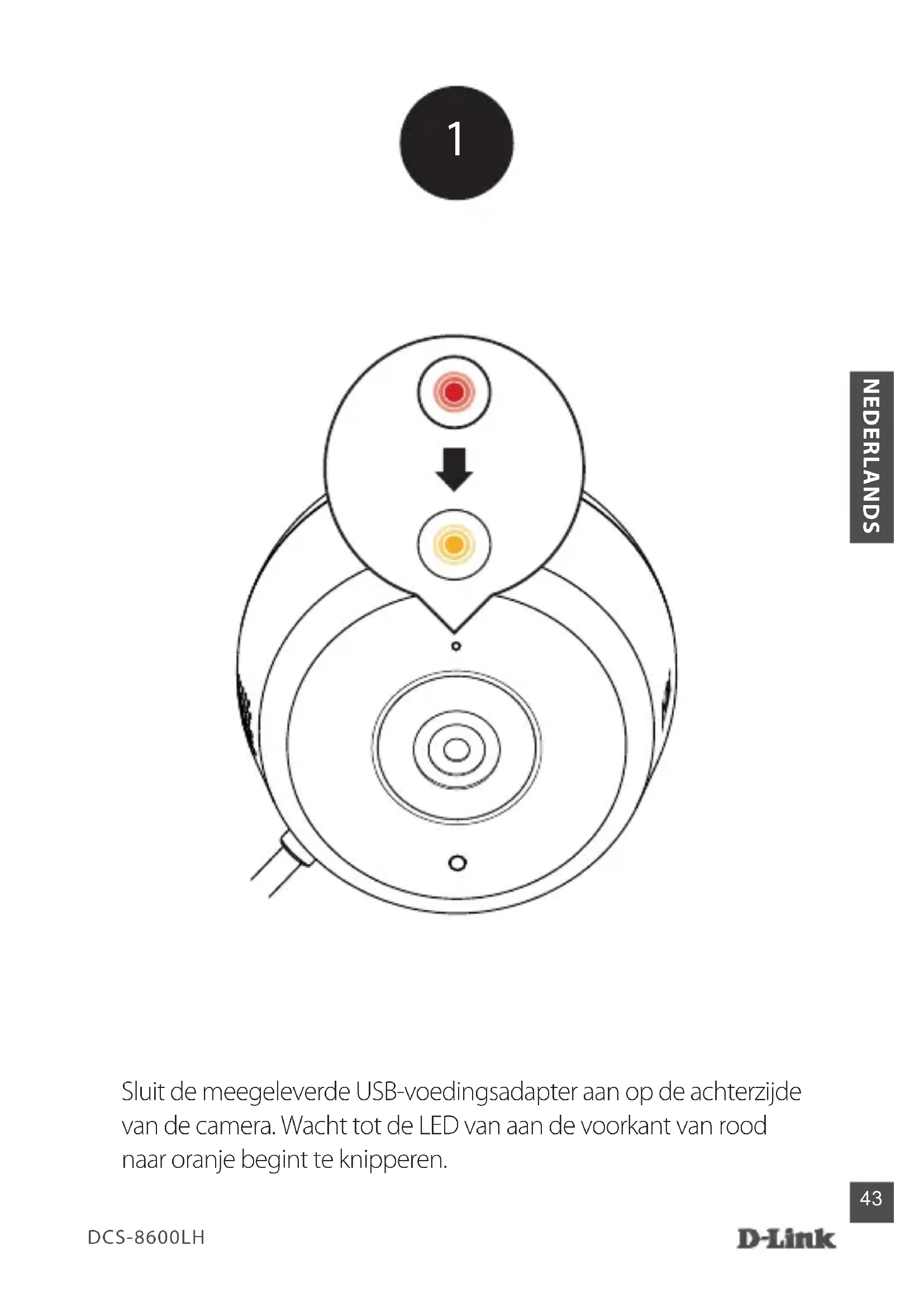 Sluit de meegeleverde USB-voedingsadapter aan op de achterzijde van de camera. Wacht tot de LED van aan de voorkant van rood naar oranje begint te knipperen.DCS-8600LH