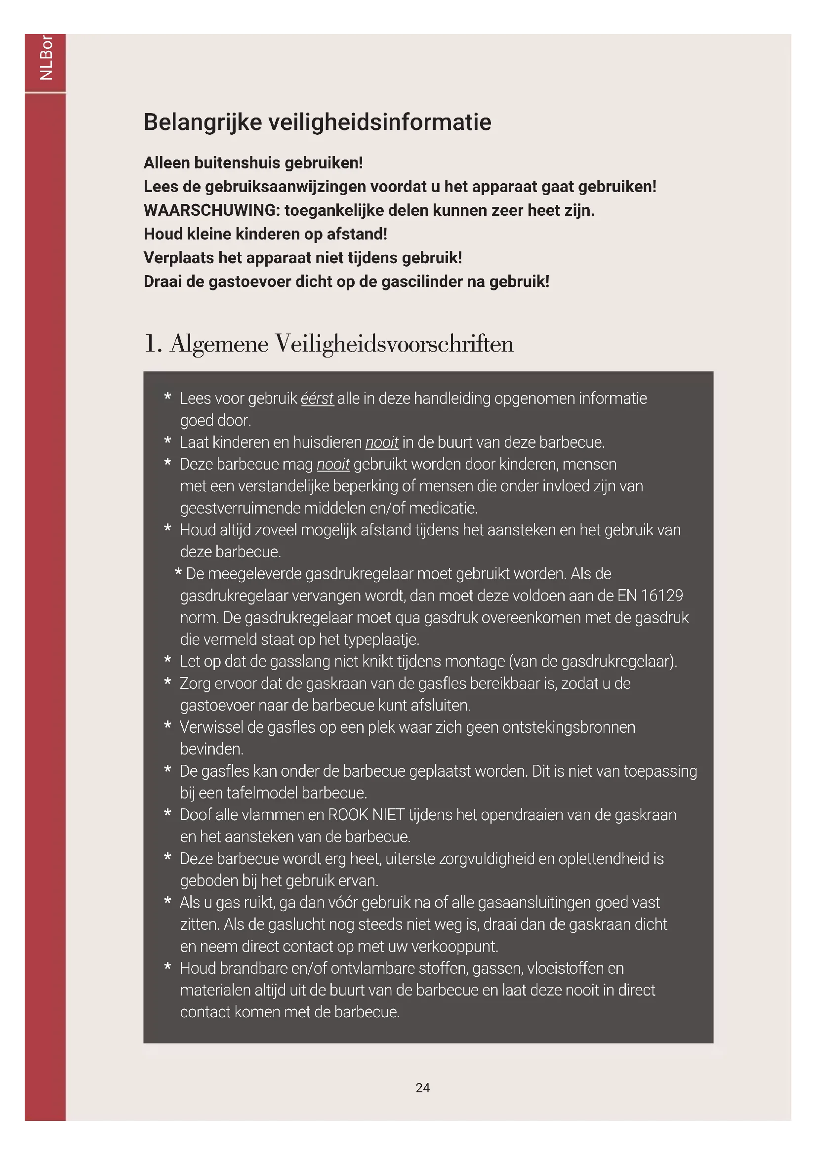 - 4. Wartung Ihres Grills ...............................................................................................7124 NLBoretti Luciano / Handleiding - Installatie advies Belangrijke veiligheidsinformatie Alleen buitenshuis gebruiken! Lees de gebruiksaanwijzingen voordat u het apparaat gaat gebruiken! WAARSCHUWING: toegankelijke delen kunnen zeer heet zijn. Houd kleine kinderen op afstand! Verplaats het apparaat niet tijdens gebruik! Draai de gastoevoer dicht op de gascilinder na gebruik!