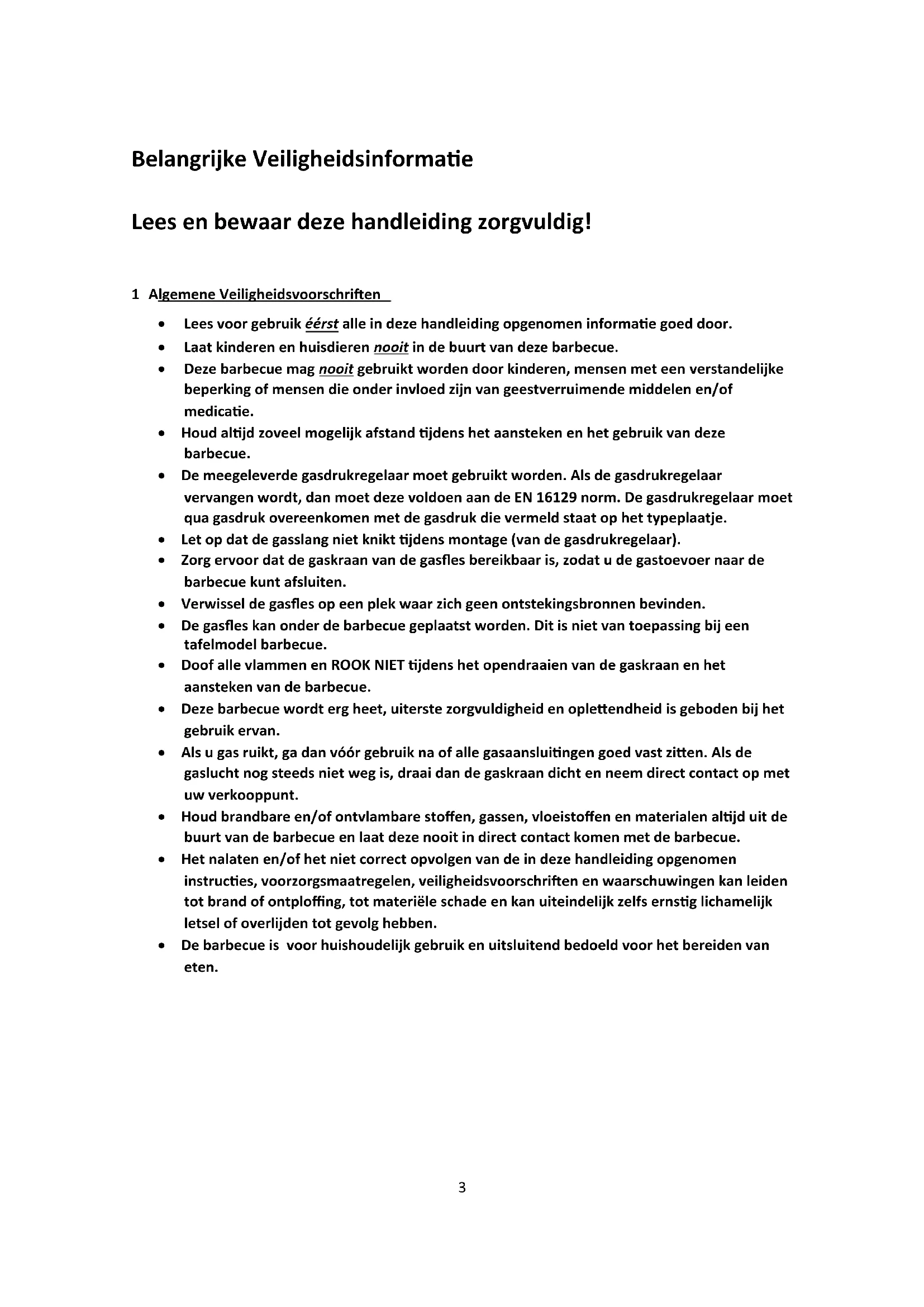 - Gebruik de barbecue uitsluitend buitenshuis (buiten) en in een goed geventileerde omgeving. Gebruik de barbecue nooit binnenshuis of in welke (deels) afgesloten ruimte dan ook. Giftige dampen kunnen zich ophopen en kunnen zeer ernstig lichamelijk letsel veroorzaken of hebben de dood tot gevolg.