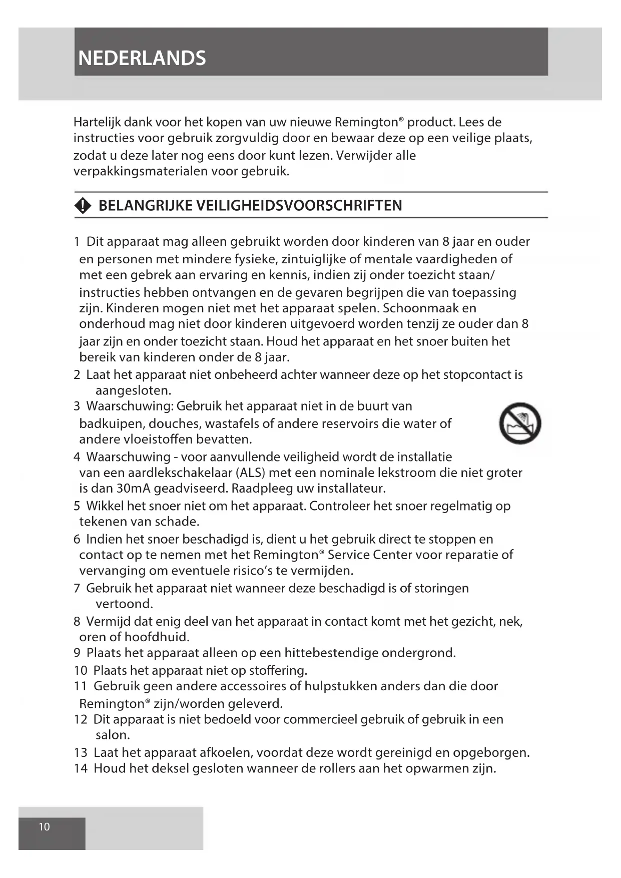 1 Dit apparaat mag alleen gebruikt worden door kinderen van 8 jaar en ouder en personen met mindere fysieke, zintuiglijke of mentale vaardigheden of met een gebrek aan ervaring en kennis, indien zij onder toezicht staan/ instructies hebben ontvangen en de gevaren begrijpen die van toepassing zijn. Kinderen mogen niet met het apparaat spelen. Schoonmaak en onderhoud mag niet door kinderen uitgevoerd worden tenzij ze ouder dan 8 jaar zijn en onder toezicht staan. Houd het apparaat en het snoer buiten het bereik van kinderen onder de 8 jaar. 2 Laat het apparaat niet onbeheerd achter wanneer deze op het stopcontact is aangesloten. 3 Waarschuwing: Gebruik het apparaat niet in de buurt van badkuipen, douches, wastafels of andere reservoirs die water of andere vloeistoen bevatten. 4 Waarschuwing - voor aanvullende veiligheid wordt de installatie van een aardlekschakelaar (ALS) met een nominale lekstroom die niet groter is dan 30mA geadviseerd. Raadpleeg uw installateur. 5 Wikkel het snoer niet om het apparaat. Controleer het snoer regelmatig op tekenen van schade. 6 Indien het snoer beschadigd is, dient u het gebruik direct te stoppen en contact op te nemen met het Remington® Service Center voor reparatie of vervanging om eventuele risico’s te vermijden. 7 Gebruik het apparaat niet wanneer deze beschadigd is of storingen vertoond. 8 Vermijd dat enig deel van het apparaat in contact komt met het gezicht, nek, oren of hoofdhuid. 9 Plaats het apparaat alleen op een hittebestendige ondergrond. 10 Plaats het apparaat niet op stoering. 11 Gebruik geen andere accessoires of hulpstukken anders dan die door Remington® zijn/worden geleverd. 12 Dit apparaat is niet bedoeld voor commercieel gebruik of gebruik in een salon. 13 Laat het apparaat afkoelen, voordat deze wordt gereinigd en opgeborgen. 14 Houd het deksel gesloten wanneer de rollers aan het opwarmen zijn. NEDERLANDS11 15 Controleer of tijdens het opwarmen elke opening een roller bevat en dat elke roller op de juiste manier in de basisunit is geplaatst. 16 NIET GESCHIKT VOOR GEBRUIK OP KUNSTHAAR OF PRUIKEN.