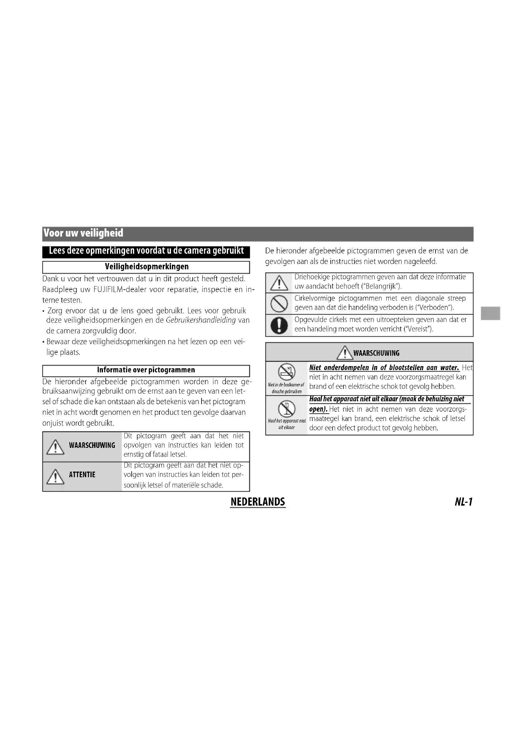 ATTENTIE ATTENTIE Houd buiten het bereik van kleine kinderen. In de handen van kinderen kan dit product letsel veroorzaken. Hanteer niet met natte handen. Het niet in acht nemen van deze voorzorgsmaatregel kan een elektrische schok tot gevolg hebben. Houd de zon uit het beeld bij het fotograferen van onder- werpen met tegenlicht. Zonlicht dat wordt scherpge- steld in de camera wanneer de zon zich in het beeld of vlakbij het beeld bevindt, kan brand of brandwonden veroorzaken. Wanneer het product niet in gebruik is, plaats de lensdop- pen terug en bewaar niet in direct zonlicht. Zonlicht dat wordt scherpgesteld door de lens kan brand of brand- wonden tot gevolg hebben. Draag de camera of lens niet terwijl deze op een statief is bevestigd. Het product kan vallen of andere voorwer- pen raken, wat letsel tot gevolg kan hebben.NL-3 NEDERLANDS Inleveren van elektrische en elektronische apparatuur in particuliere Inleveren van elektrische en elektronische apparatuur in particuliere huishoudens huishoudens In de Europese Unie, Noorwegen, IJsland en Liechtenstein: Dit symbool op het product of in de handleiding en in de garantievoorwaarden en/ of op de verpakking duidt aan dat dit product niet als huishoudelijk afval mag worden beschouwd. In plaats daarvan moet het apparaat bij een inzamelpunt voor recycling van elektrische en elektronische apparatuur worden ingeleverd. Door dit product op juiste wijze te verwijderen helpt u potentiële negatieve gevolgen voor het milieu en de gezondheid van de mens voorkomen. Onjuiste verwerking van dit product kan het milieu schaden. De recycling van materialen helpt bij het behoud van natuurlijke bronnen. Neem contact op met uw gemeente, uw inzamelpunt voor het inleveren van huishoudelijk afval of de winkel waar u het product hebt gekocht voor meer gedetailleerde informa- tie over recycling van dit product. In landen buiten de Europese Unie, Noorwegen, IJsland en Liechtenstein: Neem contact op met uw gemeente en vraag naar de juiste wijze waarop u dit product inclusief batterijen of accu’s dient te verwijderen.NL-4 NEDERLANDS Voordat u dit product gebruikt Sommige mogelijkheden van de lens zijn niet be- schikbaar bij oudere versies van de camera rmware. Zorg ervoor dat u de camera rmware bijwerkt naar de laatste versie. Instructies voor het bekijken van de camera rmware-versie en het updaten van camera rmware zijn beschikbaar op de volgende websites: http://www.fujifilm.com/support/digital_cameras/ software/#firmware Als u geen toegang hebt tot een computer, is on- dersteuning mogelijk via de plaatselijke verdeler vermeld in de “FUJIFILM Worldwide Network”- data die met uw camera wordt meegeleverd. Productverzorging