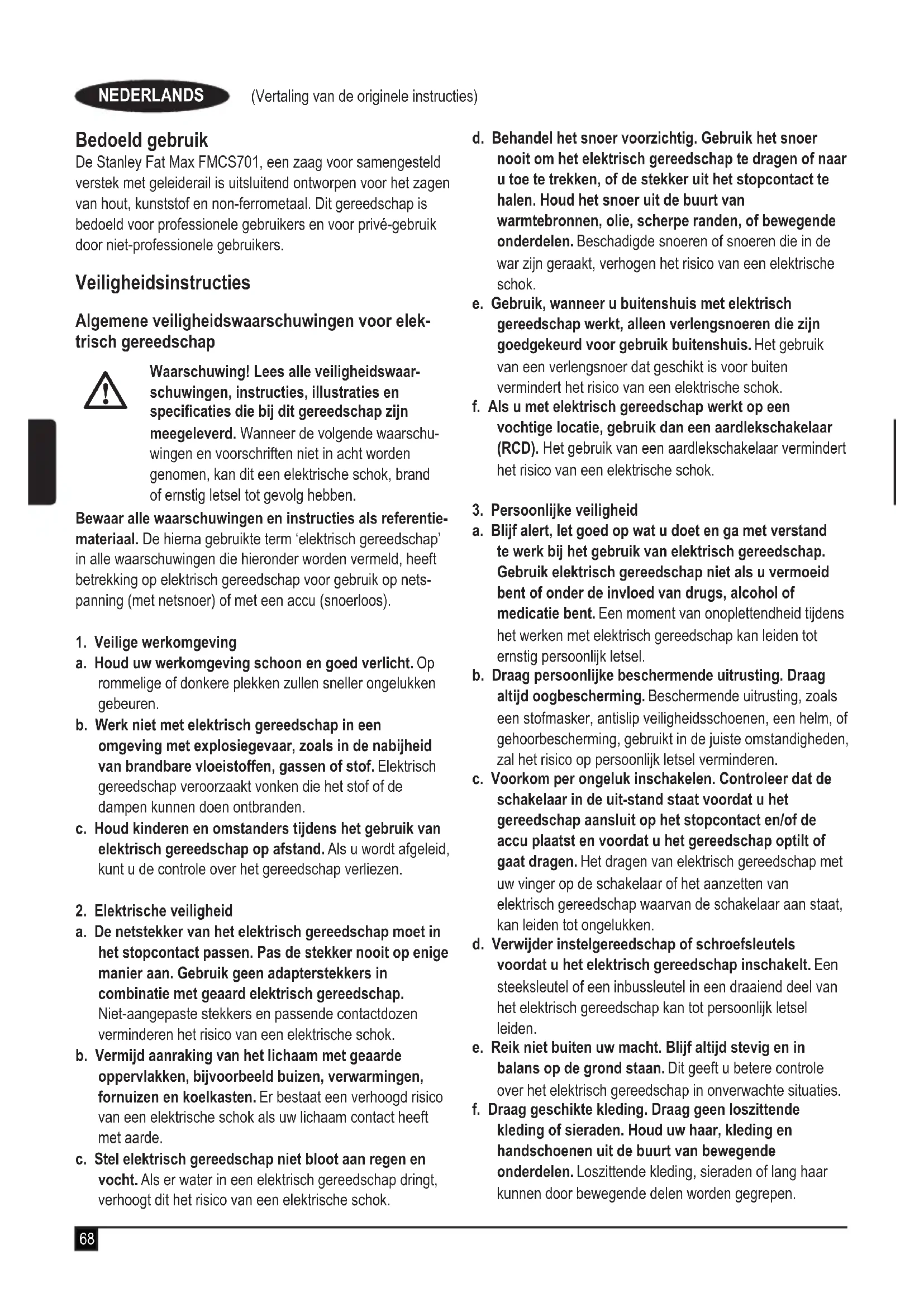 Waarschuwing! Contact met of inademing van het stof dat bij zaagtoepassingen vrijkomt, kan de gezondheid van de gebruiker en omstanders schaden. Draag een stofmasker dat speciaal is ontworpen ter bescherming tegen stof en dampen, en zorg ervoor dat andere personen op de werkplek ook zijn beschermd. u Verwerk geen materiaal dat asbest bevat. Asbest wordt beschouwd als een kankerverwekkende stof. u Draag handschoenen wanneer u zaagbladen en ruwe materialen vasthoudt (zaagbladen moeten in een houder worden vervoerd, wanneer dat praktisch mogelijk is). u Draag gehoorbescherming zodat het risico van gehoorver- lies wordt verminderd. u Overweeg het gebruik van speciaal ontworpen zaag- bladen die minder geluid maken. u Draag bescherming van uw ogen zodat het risico van persoonlijk letsel wordt beperkt. u Gebruik de bijgeleverde stofzak wanneer u hout zaagt.u Houd het gereedschap alleen vast aan geïsoleerde oppervlakken als u een handeling uitvoert waarbij het accessoire van het zaaggereedschap in contact kan komen met verborgen bedrading of het eigen netsnoer. Als een draad onder spanning wordt geraakt door het snijdende hulpstuk, komen onbedekte metalen onderdelen van het gereedschap onder spanning te staan en kunt u een elektrische schok krijgen. u Selecteer het juiste zaagblad voor het materiaal dat u wilt zagen. u Gebruik de machine niet als de beschermkap niet is aangebracht. Gebruik de machine niet als de bescher- mkap niet werkt of niet goed is onderhouden. u Controleer dat de arm stevig is vastgezet wanneer u schuine zaagsneden uitvoert. u Controleer voor iedere zaagsnede dat de machine stabiel is. u Houd de handvatten droog, schoon en vrij van olie en vet.u Houd de ruimte rond de machine schoon en vrij van losse materialen zoals spaanders en zaagresten. u Zorg dat de machine en de werkruimte goed worden verli- cht met centrale verlichting of verlichting op de werkplek. u Zorg dat de machine uitsluitend wordt bediend door mensen die daarvoor zijn opgeleid. u Controleer vóór gebruik altijd of het zaagblad correct is aangebracht. Het is belangrijk dat het zaagblad in de juiste richting draait. Houd het zaagblad scherp. Volg de instructies voor het smeren en het vervangen van acces- soires. u Controleer dat de snelheid die op het zaagblad wordt vermeld, ten minste gelijk is aan de snelheid die op de zaag wordt vermeld. u Let erop dat eventuele tussenringen en asringen geschikt zijn voor het doel dat door Stanley Fat Max wordt vermeld. u Reparaties aan het geleidingssysteem voor de zaaglijn mogen alleen worden uitgevoerd door erkende servic- emonteurs of Stanley Fat Max-servicepersoneel. u Neem de accu uit de machine voordat u onderhoudswerk uitgevoerd of het zaagblad verwisselt. u Voer nooit reinigings- of onderhoudswerkzaamheden uit en verwijder geen zaagresten of andere delen van het werkstuk uit het zaaggebied wanneer de machine draait of de zaagkop niet in de ruststand staat. u Monteer wanneer mogelijk de machine altijd op een werkbank. u Zorg dat alle vergrendelingsknoppen en handgrepen goed vastzitten voordat u de machine in gebruik neemt. u Gebruik de zaag nooit zonder het tafelelement.u Probeer nooit de draaiende machine snel te stoppen door een stuk gereedschap of een ander voorwerp tegen het72 (Vertaling van de originele instructies) NEDERLANDS zaagblad te duwen. Dit kan onbedoeld leiden tot ernstige ongevallen. u Lees de gebruikershandleiding voordat u eventuele hulpstukken gebruikt of plaatst. Onjuist gebruik van een accessoire kan schade veroorzaken. u Til de zaag uit het tafel-inzetstuk en uit het werkstuk voordat u de aan/uit-schakelaar loslaat. u Zet niet iets vast tegen de ventilator met het doel de motoras vast te zetten. u De zaagbladbeschermkap op uw zaag zal automatisch omhoog gaan wanneer de arm zakt, de kap zal over het zaagblad zakken wanneer de arm wordt opgetild. U kunt de beschermkap met de hand omhoog brengen wanneer u zaagbladen monteert of verwijdert of als u de zaag wilt inspecteren. Til de kap nooit met de hand op als de machine niet is uitgeschakeld. u Controleer zo nu en dan dat de luchtsleuven van de motor schoon zijn en dat er geen spaanders in zitten. u Zorg dat de waarschuwingssymbolen op het elektrische gereedschap altijd goed zichtbaar blijven. u Ga nooit op het elektrische gereedschap staan. Wanneer het elektrische gereedschap omvalt of wanneer u in aan- raking komt met het zaagblad, kan dit leiden tot ernstige verwondingen. u Pak het zaagblad na werkzaamheden niet vast voordat het is afgekoeld. Het zaagblad wordt tijdens het werken heel heet. u Voorkom letsel door materiaal dat wordt weggeslingerd, door eerst de accu uit de zaag te nemen, en verwijder daarna klein materiaal. u Controleer voor en na alle onderhoudswerkzaamheden dat de beschermkap van de zaag goed werkt. Let erop dat de zaag is uitgeschakeld en de accu is uitgenomen wan- neer u deze test uitvoert. Breng de arm omhoog en om- laag en controleer zo dat de beschermkap het zaagblad bedekt, maar het zaagblad de beschermkap niet raakt. Laat het gereedschap repareren door een gekwaliceerd servicecentrum als de beschermkap niet goed werkt. Informeer bij de klantenservice van Stanley Fat Max naar het dichtstbijzijnde servicecentrum. u Deze afkortzaag is uitsluitend ontworpen voor het zagen van hout, kunststof en non-ferrometaal. Gebruik de zaag niet voor het zagen van andere materialen dan die de fabrikant aanbeveelt. u Ikke ta på sagbladet før det har fått tid å kjøle seg ned etter bruk. Sagbladet kan bli svært varm ved bruk.