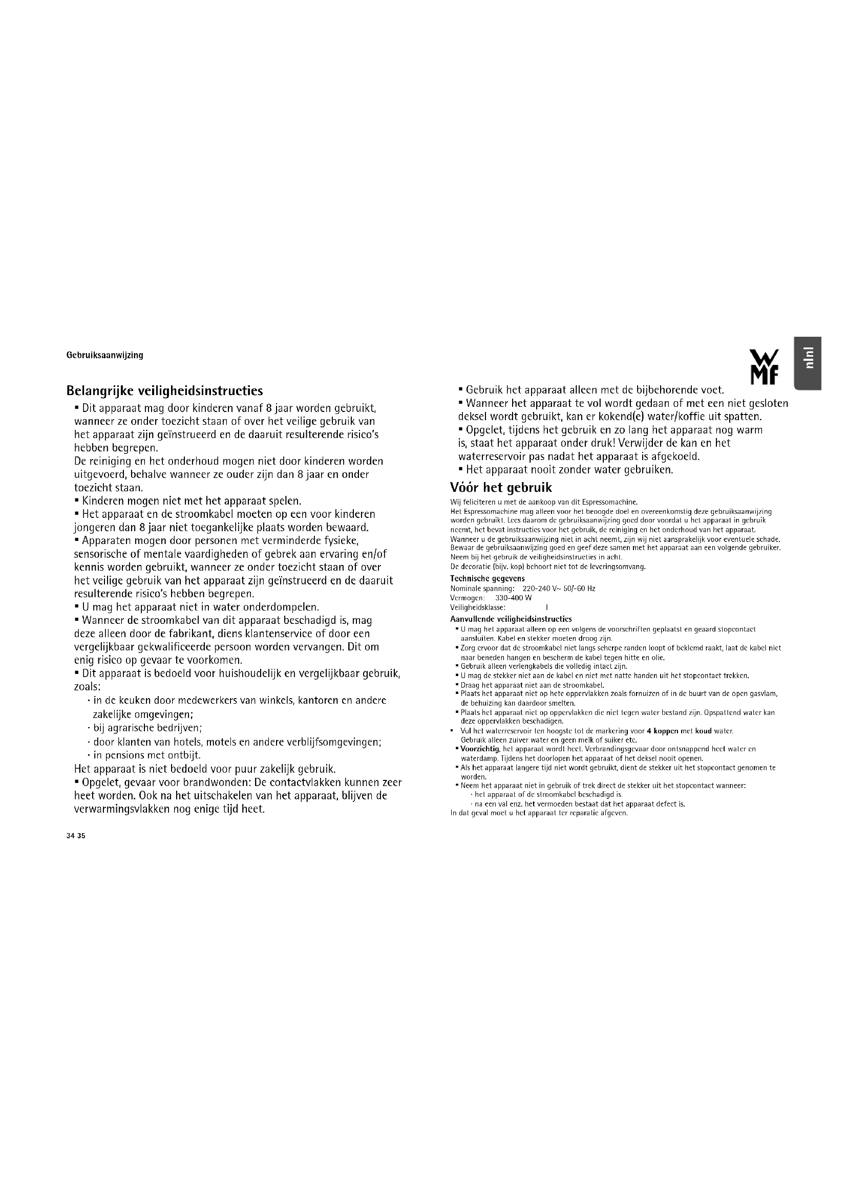 - Bij onjuist gebruik, verkeerde bediening, het niet in acht nemen van de instructies voor ontkalken of onvakkundige reparatie stellen wij ons niet aansprakelijk voor eventuele schade. In dergelijke gevallen zijn garantievergoedingen ook uitgesloten. Gebruik De WMF KEUKENmini’s® Espressomachine is een plaatsbesparend en energie-effi ciënt keukenapparaat. U kunt met het apparaat twee of vier koppen aromatische espresso bereiden De espressomachine is eenvoudig en comfortabel te bedienen. Voor optimale resultaten adviseren wij het gebruik van snelfi lter espressopoeder. Vóór het eerste gebruik Plaatsen