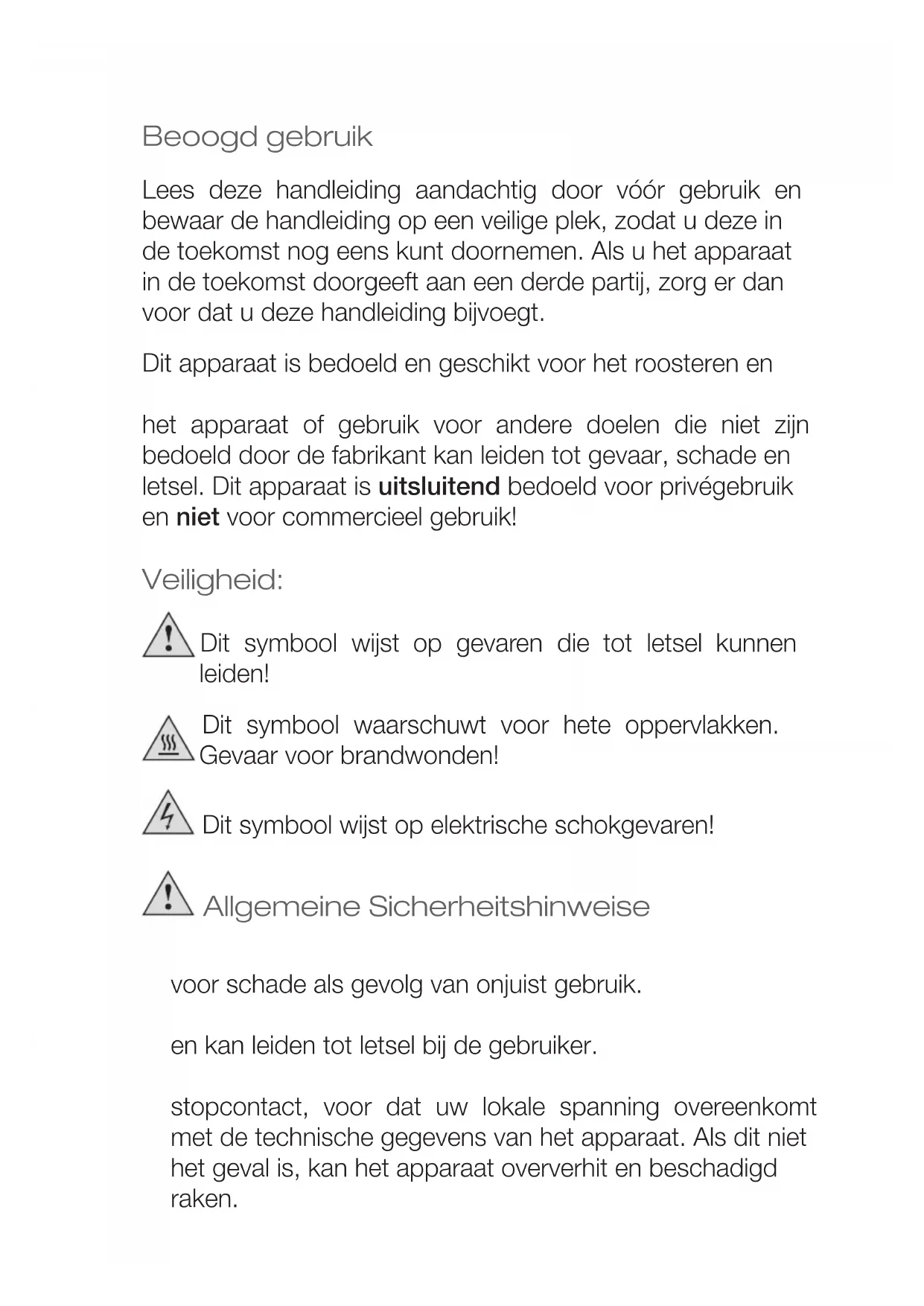 - fordamagescausedbyowner This guarantee does not affect your statutory right, nor any legal right you may have as a costumer under applicable national legislation governing the purchase of goods. Inordertoasserthis/herrightinaguaranteecaseduringthe guaranteed period, the customer must provide evidence of the date of purchase (receipt). The guarantee is to be asserted against KORONA electric GmbH, Sundern/Germany. Service Address: KORONA Service, Am Steinbach 9, 59872 Meschede, Germany Telephone Hotline: 02933 90284-80 Mail: service@korona-electric.de web: www.korona-electric.de within 2 years after the date of purchase. In case of guarantee the customer is given the right to get the appliance repaired at our own or at an authorized shop. Further rights (due to guarantee case) are not given to the customer.28 Beoogd gebruik Lees deze handleiding aandachtig door vóór gebruik en bewaar de handleiding op een veilige plek, zodat u deze in de toekomst nog eens kunt doornemen. Als u het apparaat in de toekomst doorgeeft aan een derde partij, zorg er dan voor dat u deze handleiding bijvoegt. Dit apparaat is bedoeld en geschikt voor het roosteren en opwarmenvanbroodofbroodjes/croissants.Wijzigingvan het apparaat of gebruik voor andere doelen die niet zijn bedoeld door de fabrikant kan leiden tot gevaar, schade en letsel. Dit apparaat is uitsluitend bedoeld voor privégebruik en niet voor commercieel gebruik! Veiligheid: Dit symbool wijst op gevaren die tot letsel kunnen leiden! Dit symbool waarschuwt voor hete oppervlakken. Gevaar voor brandwonden! Dit symbool wijst op elektrische schokgevaren! Allgemeine Sicherheitshinweise