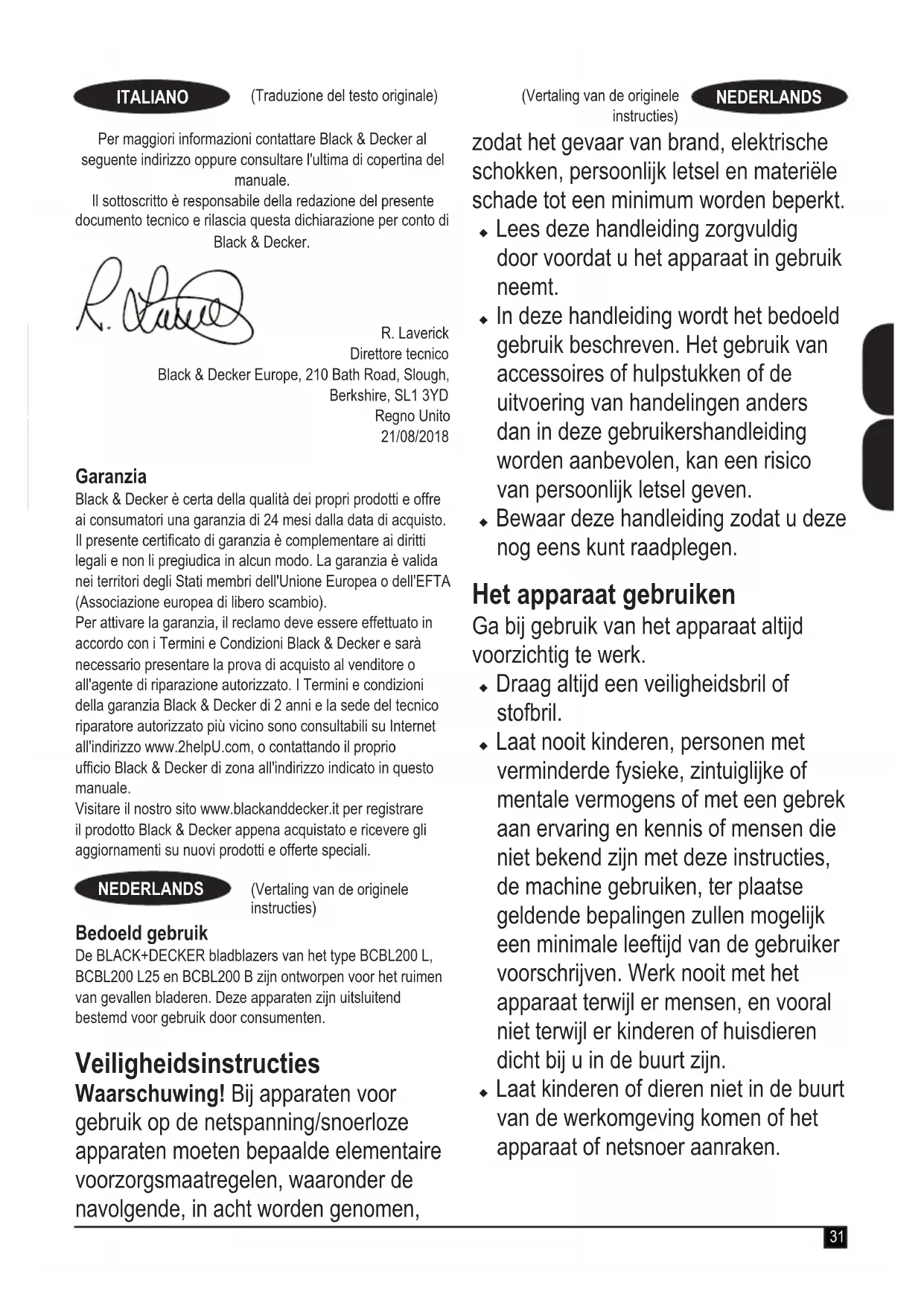 (pressione sonora garantita) 91 dB(A) Questi prodotti sono inoltre conformi alle direttive 2014/30/UE e 2011/65/UE.31 (Traduzione del testo originale) ITALIANO (Vertaling van de originele instructies) NEDERLANDS Per maggiori informazioni contattare Black & Decker al seguente indirizzo oppure consultare l'ultima di copertina del manuale. Il sottoscritto è responsabile della redazione del presente documento tecnico e rilascia questa dichiarazione per conto di Black & Decker. R. Laverick Direttore tecnico Black & Decker Europe, 210 Bath Road, Slough, Berkshire, SL1 3YD Regno Unito 21/08/2018 Garanzia Black & Decker è certa della qualità dei propri prodotti e offre ai consumatori una garanzia di 24 mesi dalla data di acquisto. Il presente certicato di garanzia è complementare ai diritti legali e non li pregiudica in alcun modo. La garanzia è valida nei territori degli Stati membri dell'Unione Europea o dell'EFTA (Associazione europea di libero scambio). Per attivare la garanzia, il reclamo deve essere effettuato in accordo con i Termini e Condizioni Black & Decker e sarà necessario presentare la prova di acquisto al venditore o all'agente di riparazione autorizzato. I Termini e condizioni della garanzia Black & Decker di 2 anni e la sede del tecnico riparatore autorizzato più vicino sono consultabili su Internet all'indirizzo www.2helpU.com, o contattando il proprio ufcio Black & Decker di zona all'indirizzo indicato in questo manuale. Visitare il nostro sito www.blackanddecker.it per registrare il prodotto Black & Decker appena acquistato e ricevere gli aggiornamenti su nuovi prodotti e offerte speciali. Bedoeld gebruik De BLACK+DECKER bladblazers van het type BCBL200 L, BCBL200 L25 en BCBL200 B zijn ontworpen voor het ruimen van gevallen bladeren. Deze apparaten zijn uitsluitend bestemd voor gebruik door consumenten. Veiligheidsinstructies Waarschuwing! Bij apparaten voor gebruik op de netspanning/snoerloze apparaten moeten bepaalde elementaire voorzorgsmaatregelen, waaronder de navolgende, in acht worden genomen, (Vertaling van de originele instructies) NEDERLANDS zodat het gevaar van brand, elektrische schokken, persoonlijk letsel en materiële schade tot een minimum worden beperkt. u Lees deze handleiding zorgvuldig door voordat u het apparaat in gebruik neemt. u In deze handleiding wordt het bedoeld gebruik beschreven. Het gebruik van accessoires of hulpstukken of de uitvoering van handelingen anders dan in deze gebruikershandleiding worden aanbevolen, kan een risico van persoonlijk letsel geven. u Bewaar deze handleiding zodat u deze nog eens kunt raadplegen. Het apparaat gebruiken Ga bij gebruik van het apparaat altijd voorzichtig te werk. u Draag altijd een veiligheidsbril of stofbril. u Laat nooit kinderen, personen met verminderde fysieke, zintuiglijke of mentale vermogens of met een gebrek aan ervaring en kennis of mensen die niet bekend zijn met deze instructies, de machine gebruiken, ter plaatse geldende bepalingen zullen mogelijk een minimale leeftijd van de gebruiker voorschrijven. Werk nooit met het apparaat terwijl er mensen, en vooral niet terwijl er kinderen of huisdieren dicht bij u in de buurt zijn. u Laat kinderen of dieren niet in de buurt van de werkomgeving komen of het apparaat of netsnoer aanraken.32 (Vertaling van de originele instructies) NEDERLANDS u Let extra goed op wanneer u de machine in de buurt van kinderen gebruikt. u Dit apparaat mag niet zonder supervisie door jonge of lichamelijk zwakke mensen worden gebruikt. u Dit apparaat mag niet als speelgoed worden gebruikt. u Gebruik het apparaat alleen bij daglicht of goed kunstlicht. u Gebruik het apparaat alleen op een droge locatie. Laat het apparaat niet nat worden. u Gebruik het apparaat niet onder slechte weersomstandigheden, vooral niet wanneer er onweer dreigt. u Dompel het apparaat niet onder in water. u Open de behuizing niet. De machine bevat geen onderdelen die door de gebruiker kunnen worden gerepareerd. u Gebruik het apparaat niet in een omgeving met explosiegevaar, zoals in de nabijheid van brandbare vloeistoffen, gassen of stof. u Het apparaat mag alleen worden gebruikt met de voeding die erbij wordt geleverd. Overige risico's. Er kunnen zich bij het gebruik van dit gereedschap nog meer risico's voordoen, die mogelijk niet in de bijgesloten veiligheidswaarschuwingen worden beschreven. Deze risico's kunnen zich voordoen door onoordeelkundig gebruik, langdurig gebruik, enz. Zelfs wanneer de veiligheidsvoorschriften in acht worden genomen en de veiligheidshulpmiddelen worden gebruikt, kunnen bepaalde risico's niet worden uitgesloten. Dit zijn onder meer: u Letsel veroorzaakt door het aanraken van draaiende of bewegende onderdelen. u Verwondingen die worden veroorzaakt bij het vervangen van onderdelen, messen of accessoires. u Verwondingen die worden veroorzaakt door langdurig gebruik van gereedschap. Wanneer u langere periodes met gereedschap werkt, kunt u het beste regelmatig een pauze nemen. u Gehoorbeschadiging. u Gezondheidsrisico's door het inademen van stof dat vrijkomt tijdens het gebruik van uw gereedschap (bijvoorbeeld: het werken met hout, met name eiken, beuken en MDF). Na gebruik u Bewaar het apparaat, wanneer u het niet gebruikt, op een droge, goed geventileerde plaats, buiten het bereik van kinderen. u Houd apparaten buiten het bereik van kinderen, ook wanneer ze zijn opgeborgen. u Wanneer het apparaat in de auto ligt, moet u het in de kofferruimte plaatsen of goed vastzetten, zodat het niet kan bewegen bij plotselinge veranderingen in snelheid of richting.33 (Vertaling van de originele instructies) NEDERLANDS Inspectie en reparaties u Controleer het apparaat vóór gebruik op beschadigde en defecte onderdelen. Controleer het apparaat vooral op gebroken onderdelen en andere omstandigheden die de werking ervan kunnen beïnvloeden. u Gebruik het apparaat niet als een of meer onderdelen beschadigd of defect is. u Laat beschadigde of defecte onderdelen door een geautoriseerde serv