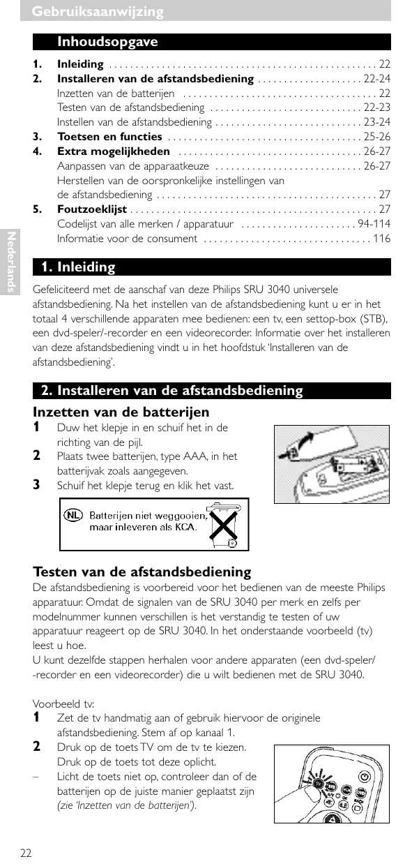 richting van de pijl. Plaats twee batterijen, type AAA, in het batterijvak zoals aangegeven. Schuif het klepje terug en klik het vast. Testen van de afstandsbediening De afstandsbediening is voorbereid voor het bedienen van de meeste Philips apparatuur. Omdat de signalen van de SRU 3040 per merk en zelfs per modelnummer kunnen verschillen is het verstandig te testen of uw apparatuur reageert op de SRU 3040. In het onderstaande voorbeeld (tv) leest u hoe. U kunt dezelfde stappen herhalen voor andere apparaten (een dvd-speler/ -recorder en een videorecorder) die u wilt bedienen met de SRU 3040. Voorbeeld tv: 1 Zet de tv handmatig aan of gebruik hiervoor de originele afstandsbediening. Stem af op kanaal 1. 2 Druk op de toets TV om de tv te kiezen. Druk op de toets tot deze oplicht. Licht de toets niet op, controleer dan of de batterijen op de juiste manier geplaatst zijn (zie ‘Inzetten van de batterijen’).