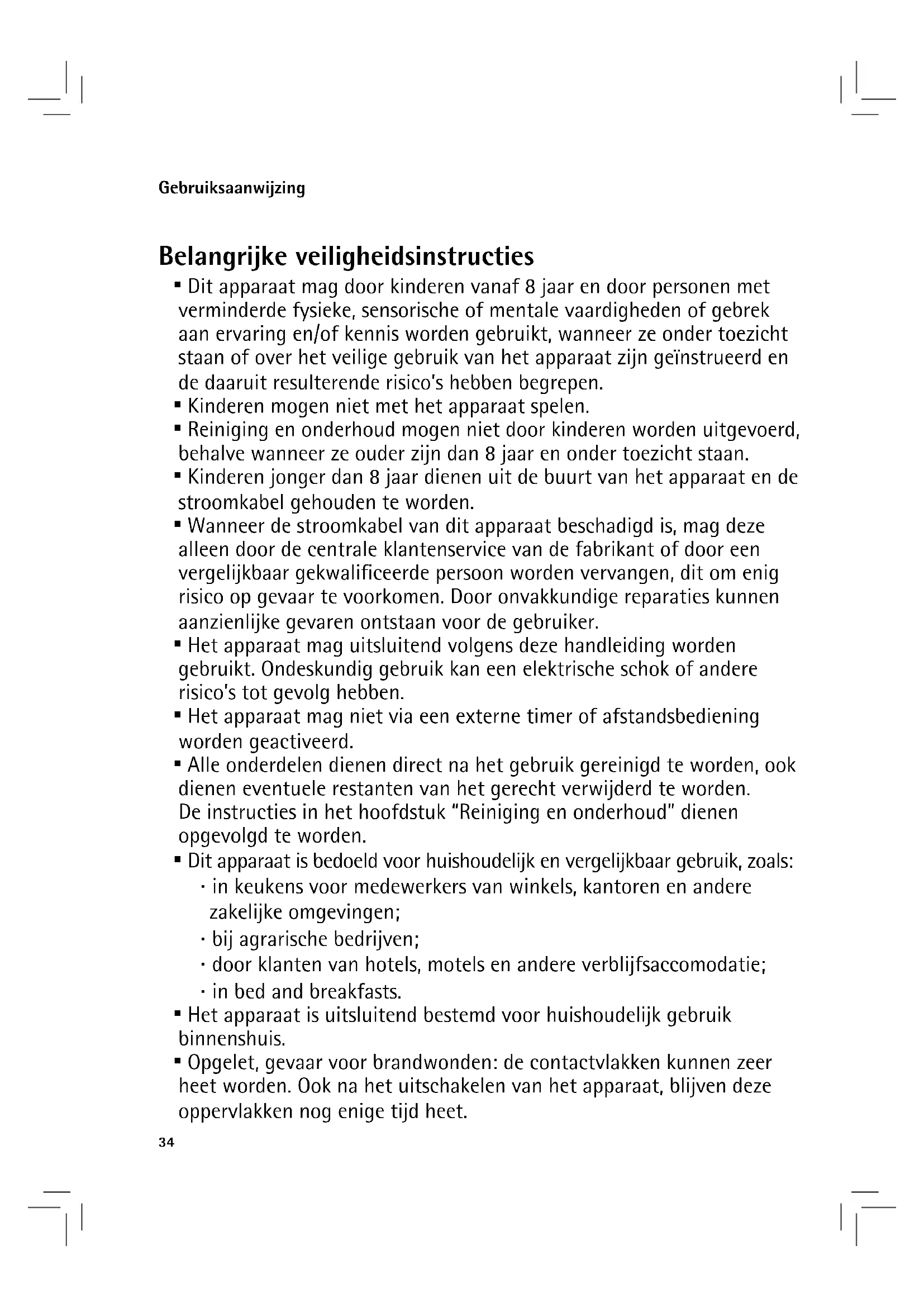 - Opgelet, gevaar voor brandwonden: de contactvlakken kunnen zeer heet worden. Ook na het uitschakelen van het apparaat, blijven deze oppervlakken nog enige tijd heet.35